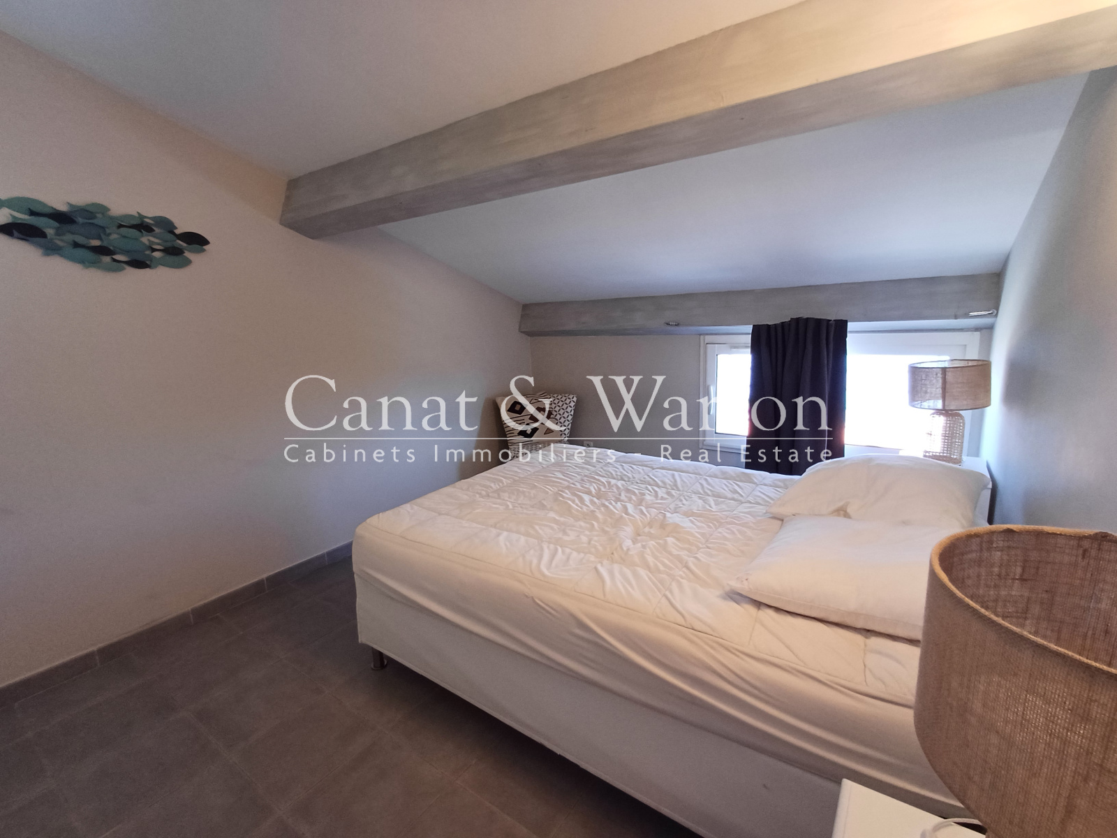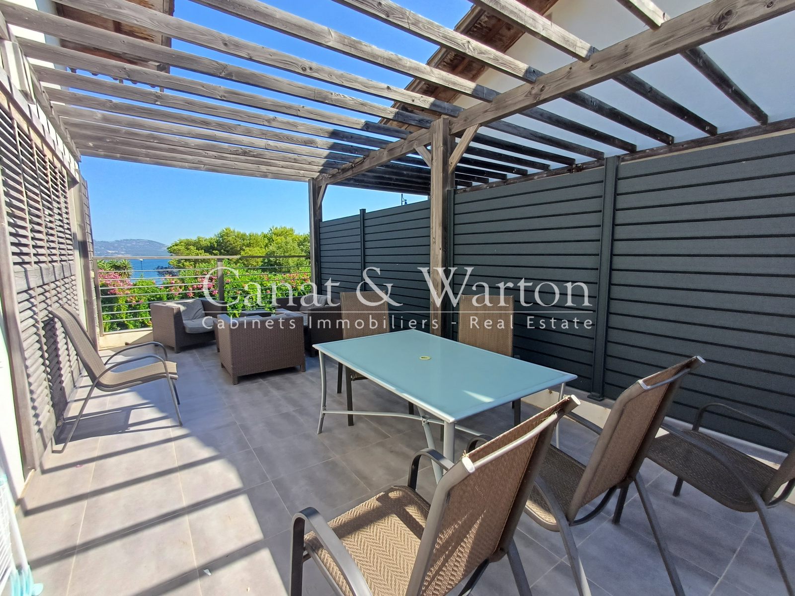 Hyères, presqu'île de Giens, proche plage et petit port de pêche, très belle vue mer pour ce duplex au dernier étage de 119m² habitables (103m² loi Carrez) comprenant un salon-séjour et une cuisine ouverte équipée et aménagée le tout donnant sur belle terrasse de 48m², un coin bureau, 3 chambres dont une avec salle de bains privative + 2ème salle de bains, parking privatif couvert et chalet. Ideal pied à terre pour les vacances. Bon rendement locatif. Rare à la vente dans un cadre unique !