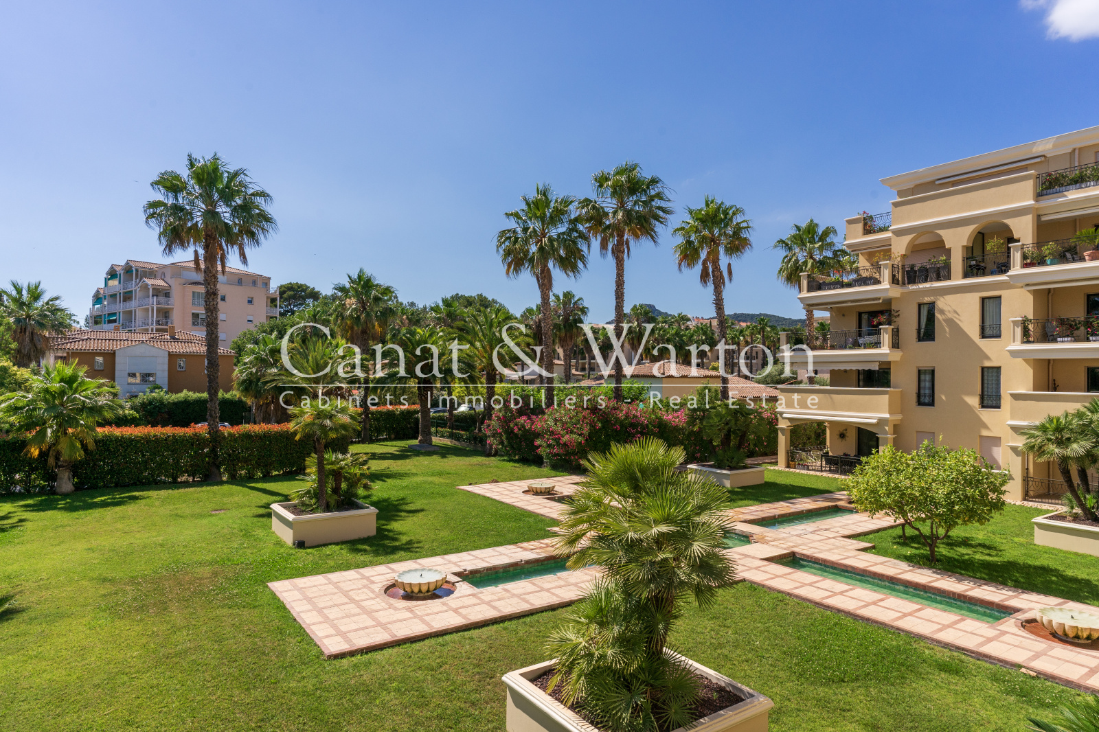 Hyères au sein d'une résidence de très bon standing, proche centre-ville, belle vue dégagée sur parc et bassins intérieurs, au calme, superbe appartement T4 de 104 m² aux prestations de qualité, pièce de vie donnant sur terrasse de 26m², cuisine aménagée-équipée semi ouverte, 3 chambres dont une suite parentale avec salle d'eau, et une avec balcon privatif, 2ème salle d'eau, dressing, garage double en sous-sol de 23 m² avec porte automatisée. A voir !