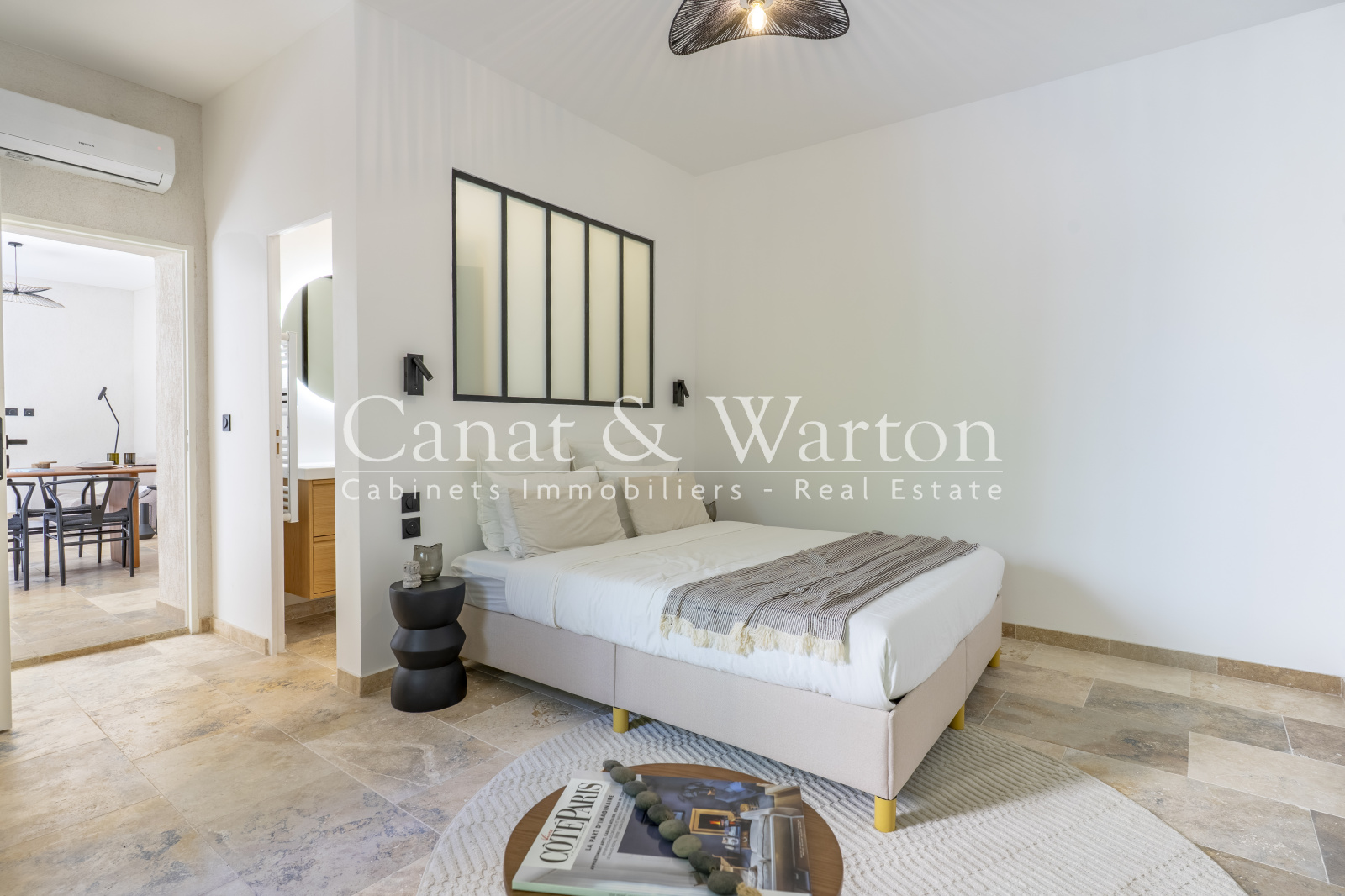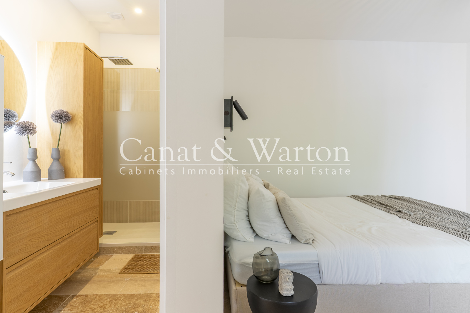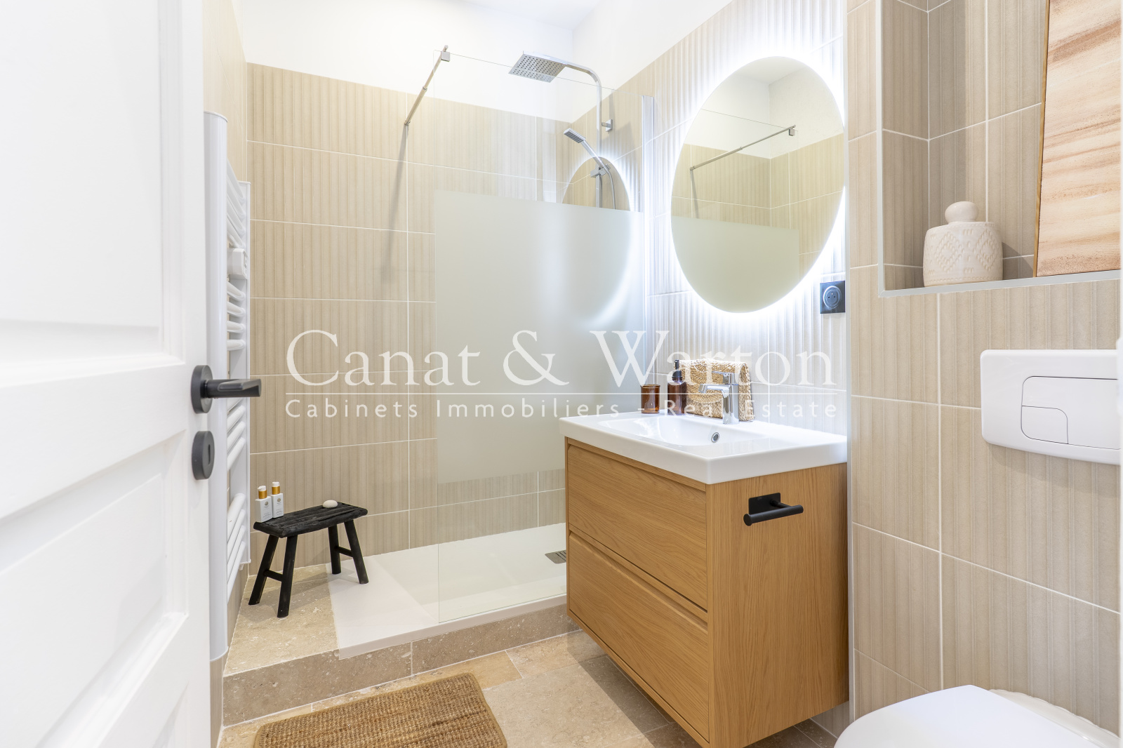 HYERES, au début du quartier historique, passez la porte d'une ancienne demeure typique de la vieille ville ou vous retrouverez le charme de l'ancien et des vieilles tomettes au sol et découvrez cet appartement T4 situé au 1er étage, aux volumes généreux, entièrement rénové avec des matériaux de qualité : travertin, meubles bois chaleureux pour les salles d'eau, cuisine sobre et élégante entièrement équipée. Il offre un vaste séjour avec cuisine semi-ouverte, arrière cuisine-buanderie et toilettes, une suite avec salle d'eau, une chambre, une grande salle d'eau avec toilettes et un bureau. L'ensemble dégage une ambiance apaisante et zen qui se poursuit lorsque l'on arrive sur l'exterieur : un beau patio privatif de 130 m² arboré et terrassé de bois invite à la détente. Véritable hâvre de paix en coeur de ville, ce bien est idéal pour profiter de la ville à pied, à quelques pas du centre et de ses commerces. Vie à l'année ou pied à terre, pour les amoureux du vieux Hyères. Stationnement libre à quelques rues, parking Olbia et clemenceau à proximité