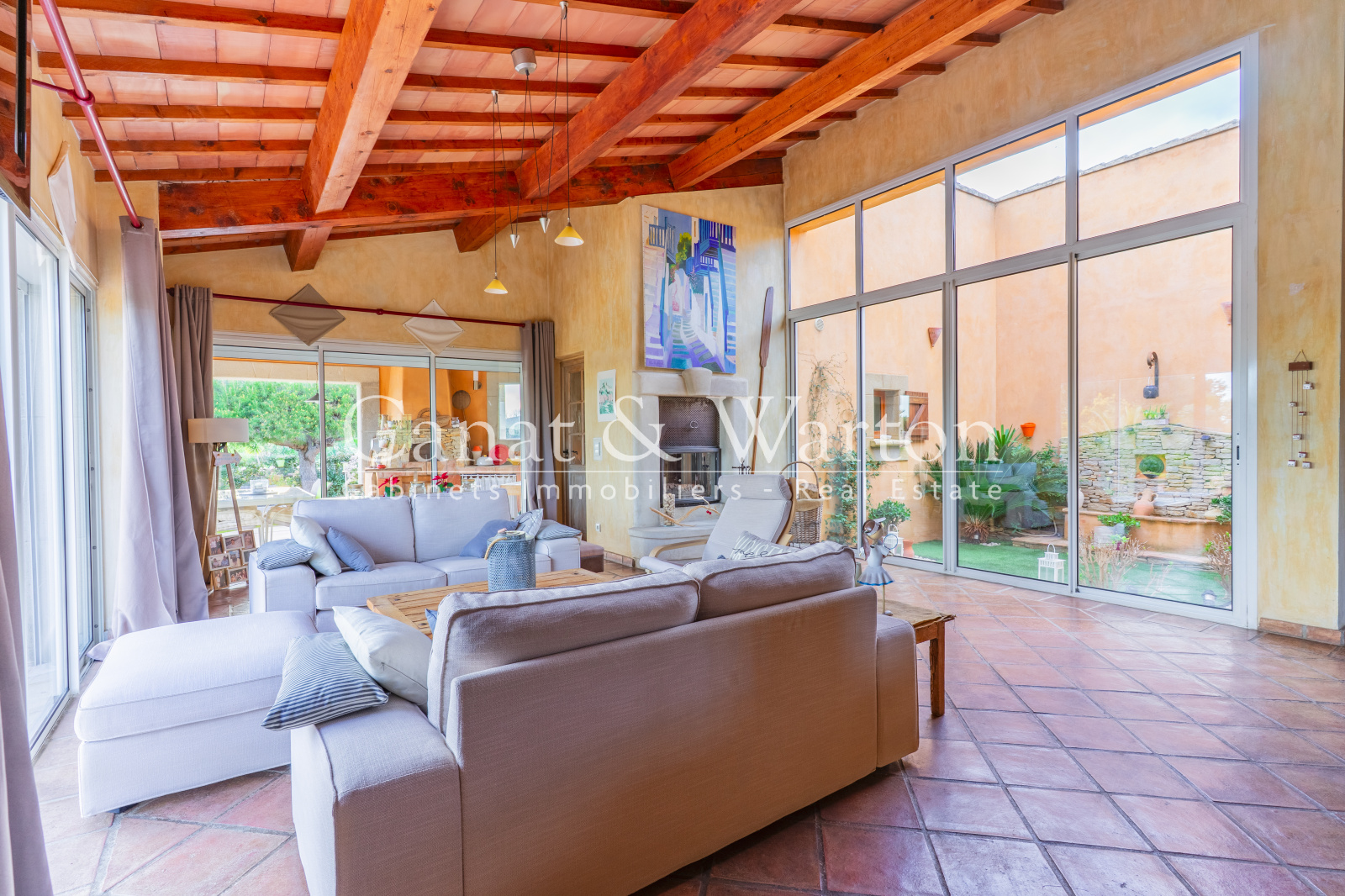 Dès l'entrée, un joli patio donne le ton. La pièce de vie, sublimée par une belle hauteur sous plafond, un parfeuille en tuiles anciennes et un insert, constitue un véritable espace de convivilaité.
