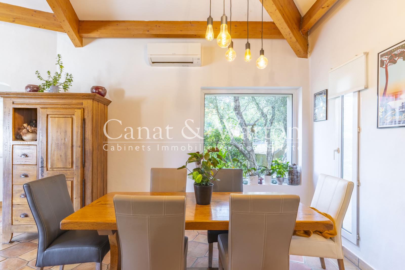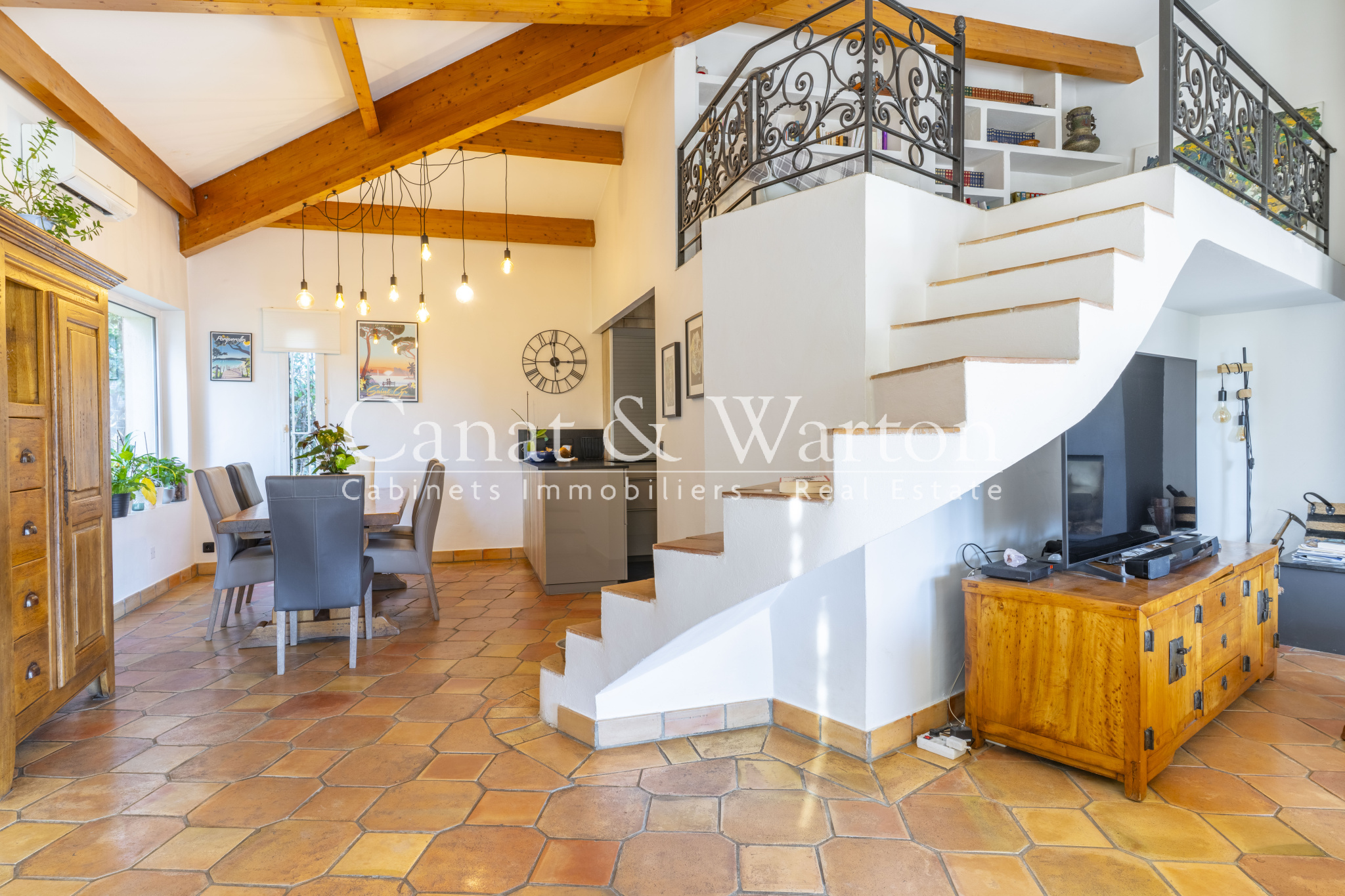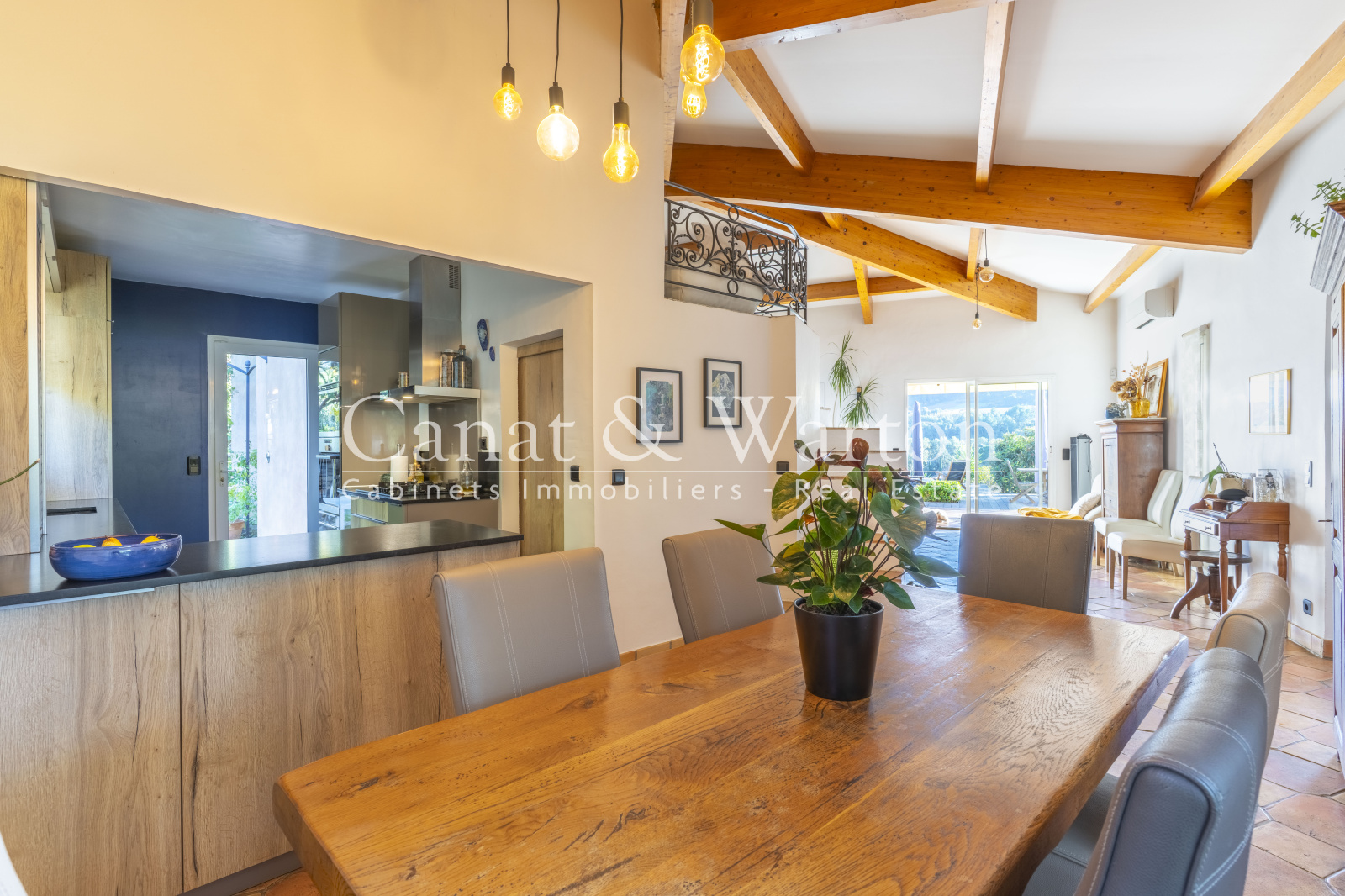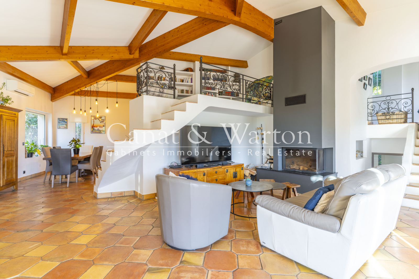 Cette propriété développant 142 m² se compose d'une entrée avec toilettes invités menant à une vaste pièce de vie de 60 m² comprenant un séjour et une salle à manger baignés de lumière grâce à leur exposition plein sud, agrémentés d’une charpente apparente et d’une cheminée récente avec insert. Une mezzanine aménagée en coin lecture surplombe l’ensemble et accentue le charme et la hauteur du lieu. La cuisine ouverte est fonctionnelle avec une arrière-cuisine s’ouvrant sur une terrasse accueillante, embellie par un abri bois et une superbe glycine.