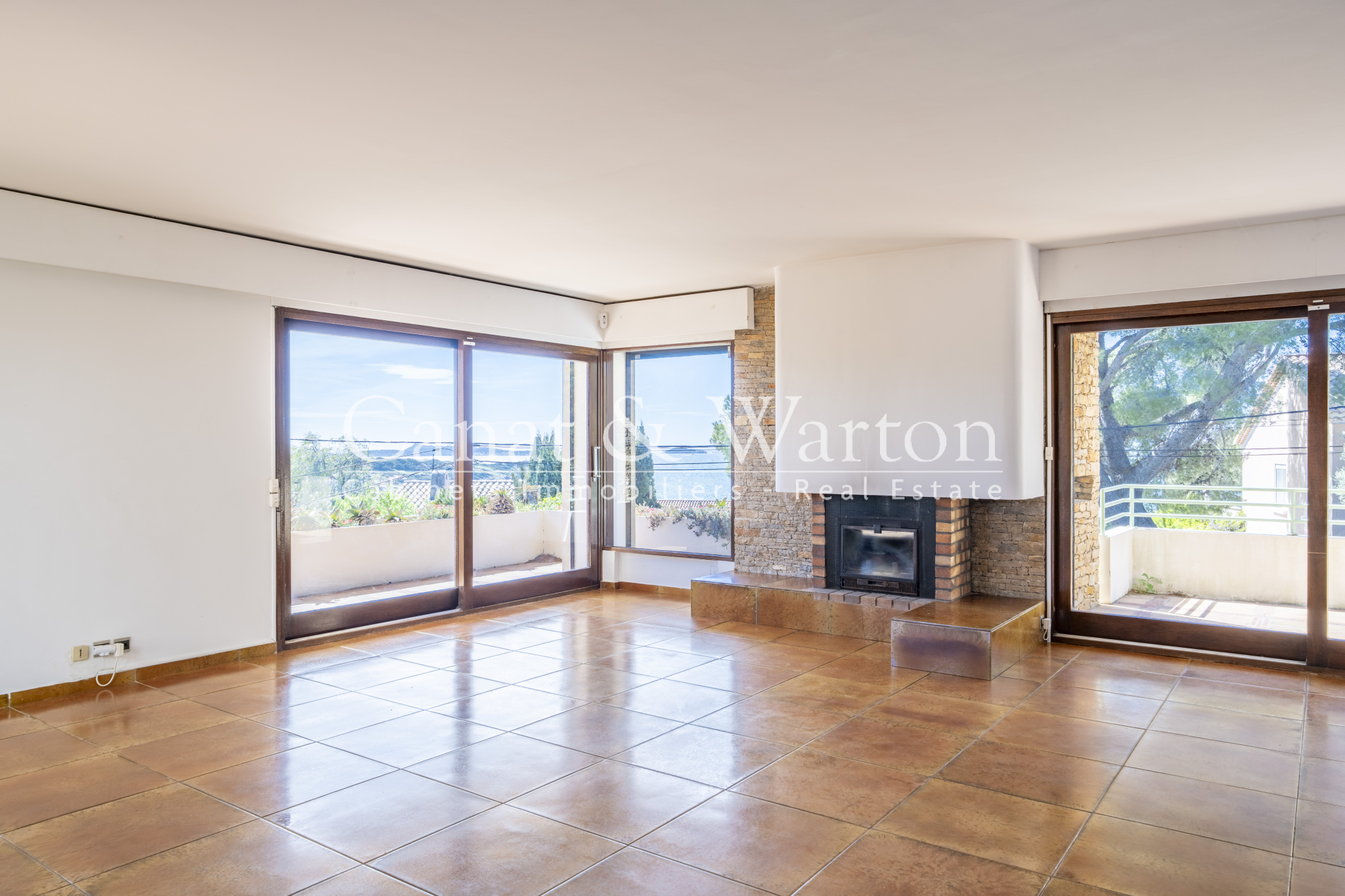 À l’étage, l’entrée s’ouvre sur un vaste séjour baigné de lumière de 50 m², prolongé par une terrasse de 25 m² tournée vers la mer. Une cuisine, deux chambres et une salle de bain complètent ce niveau.