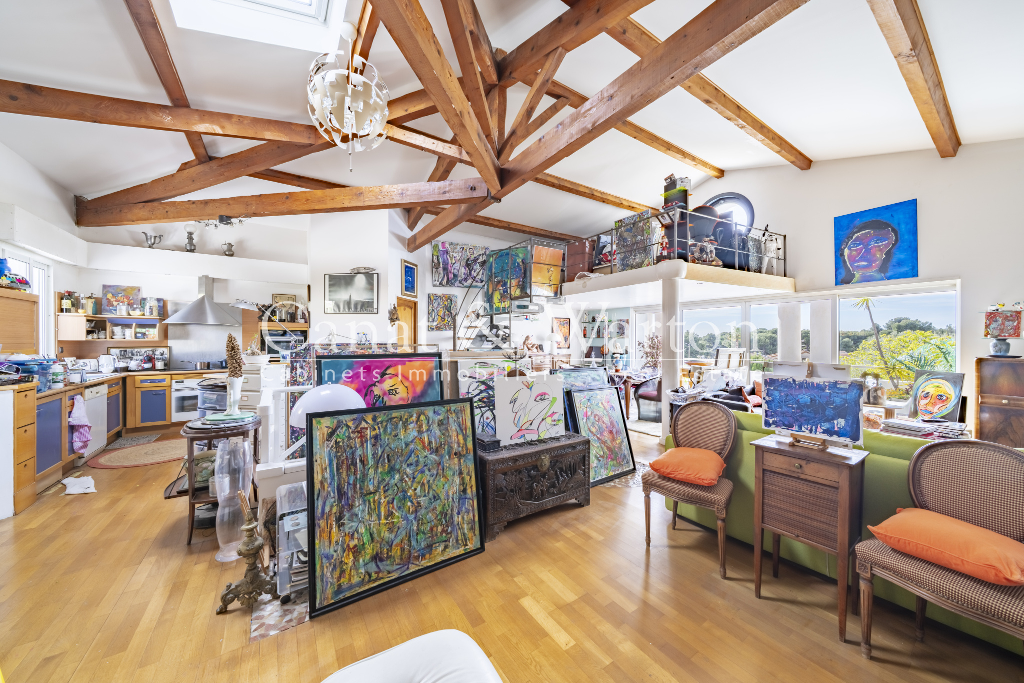 A l'étage, un vaste salon de 70 m2 ouvrant sur une agréable terrasse de 20 m2, une cuisine entièrement équipée, un wc avec lave-mains, une mezzanine avec bureau.