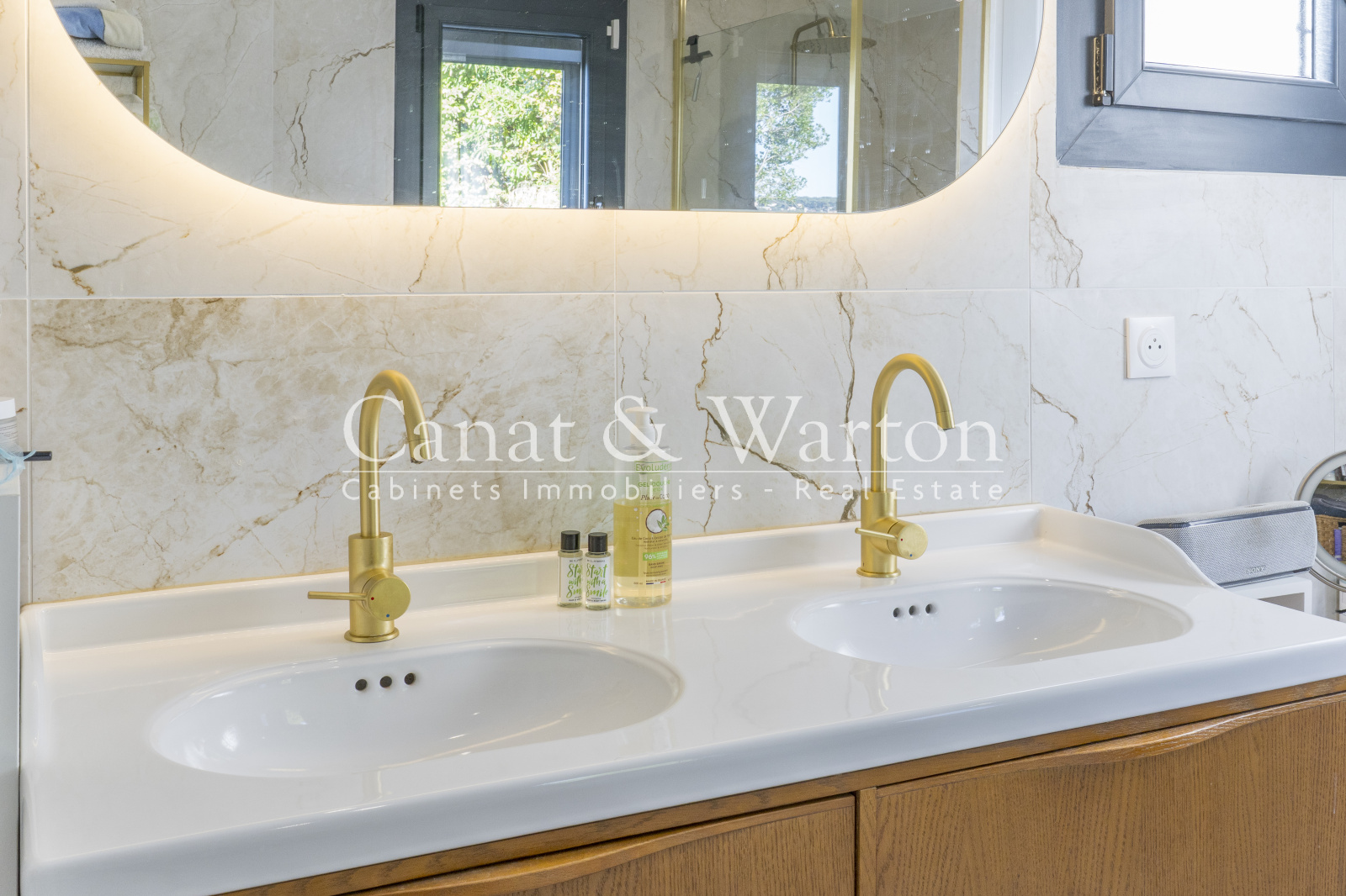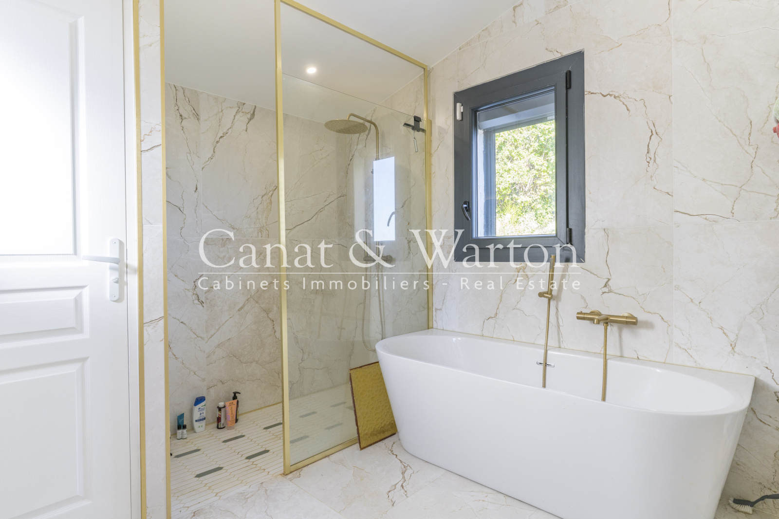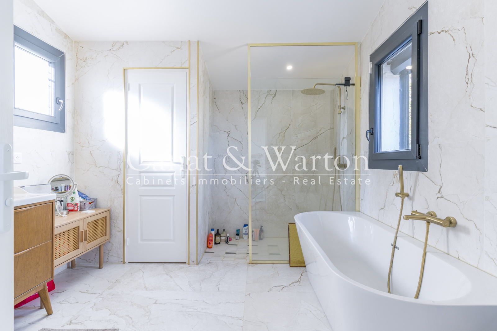 À l’étage une luxueuse master suite avec dressing, salle de bains incluant douche et baignoire, une terrasse privative offrant une vue panoramique sur la mer.