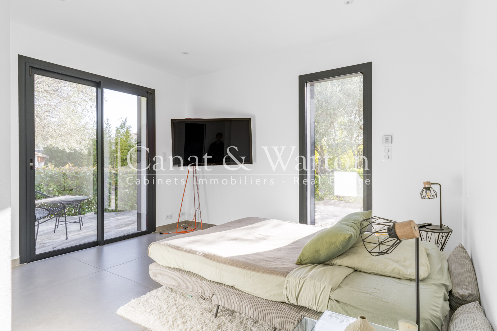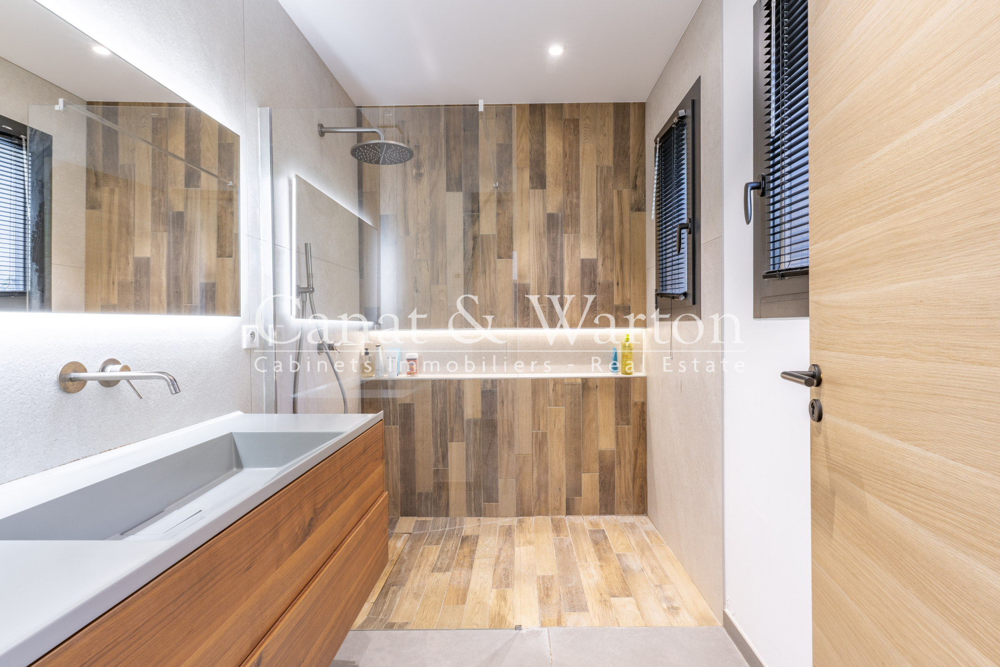 Développant environ 170 m2 habitables, la propriété est baignée de lumière grâce à de larges baies vitrées et une hauteur sous plafond remarquable (jusqu'à 3,40 m), ouvrant sur de vastes terrasses en bois exotique et un jardin paysager.