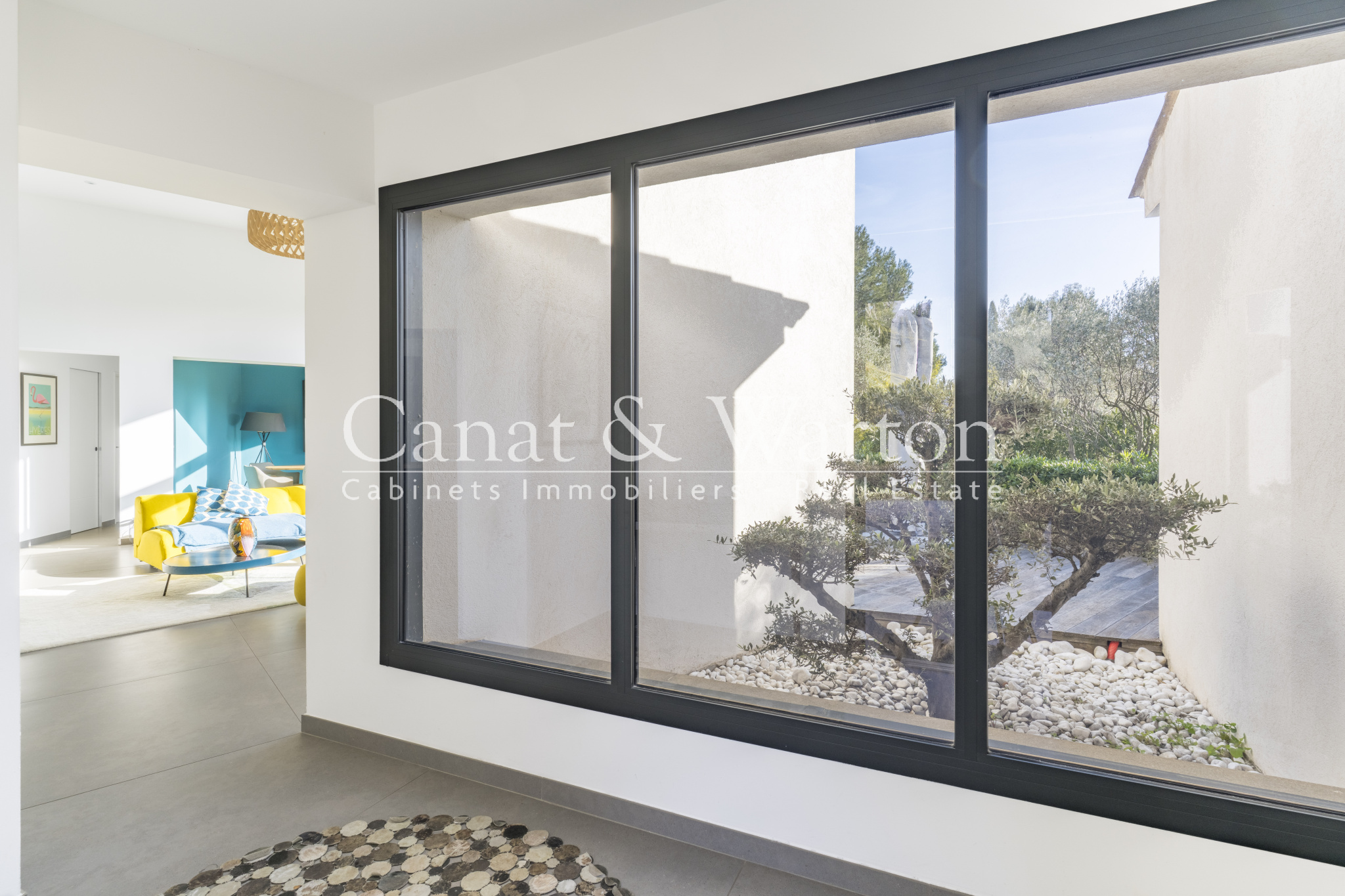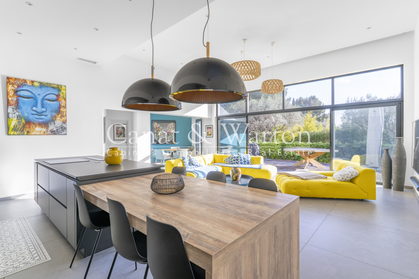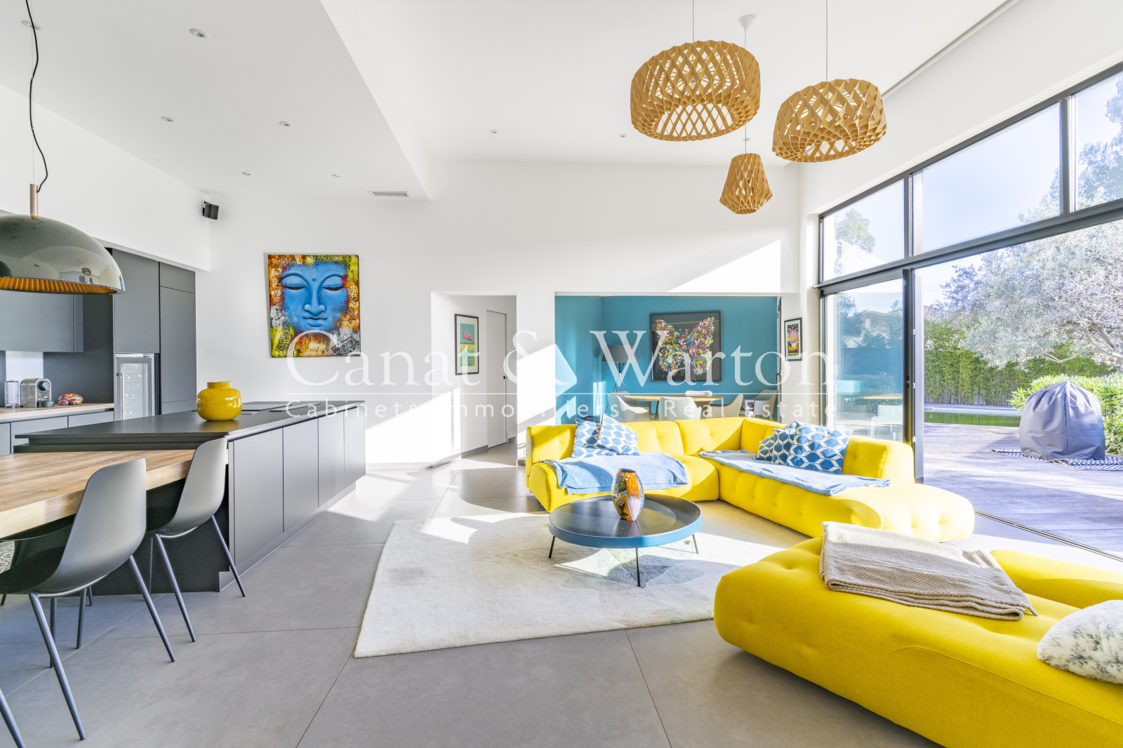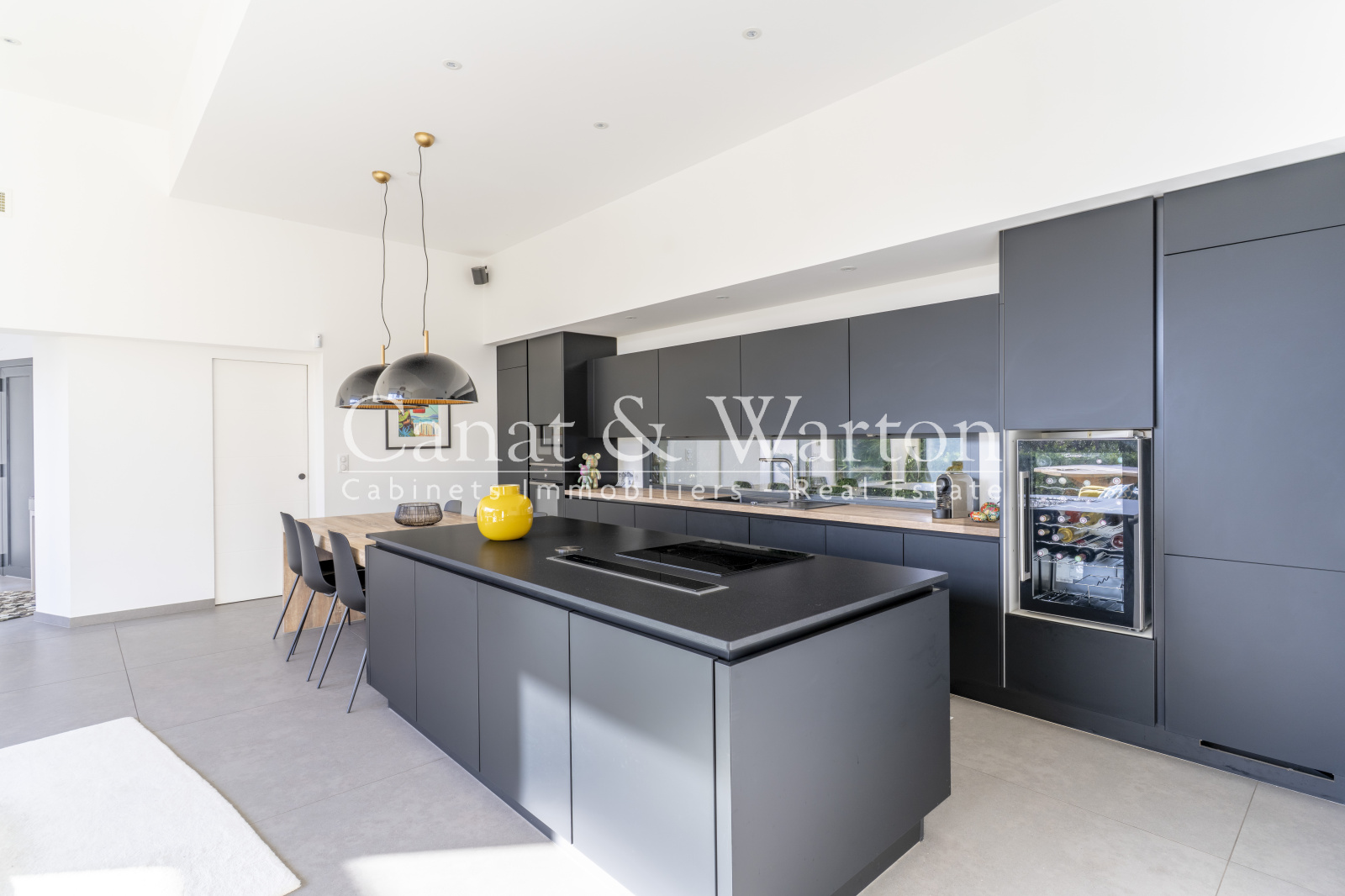 Le coeur de la maison s'articule autour d'un séjour - salon d'exception de plus de 60 m2, à l'atmosphère traversante offrant un accès direct aux terrasses et à la piscine.