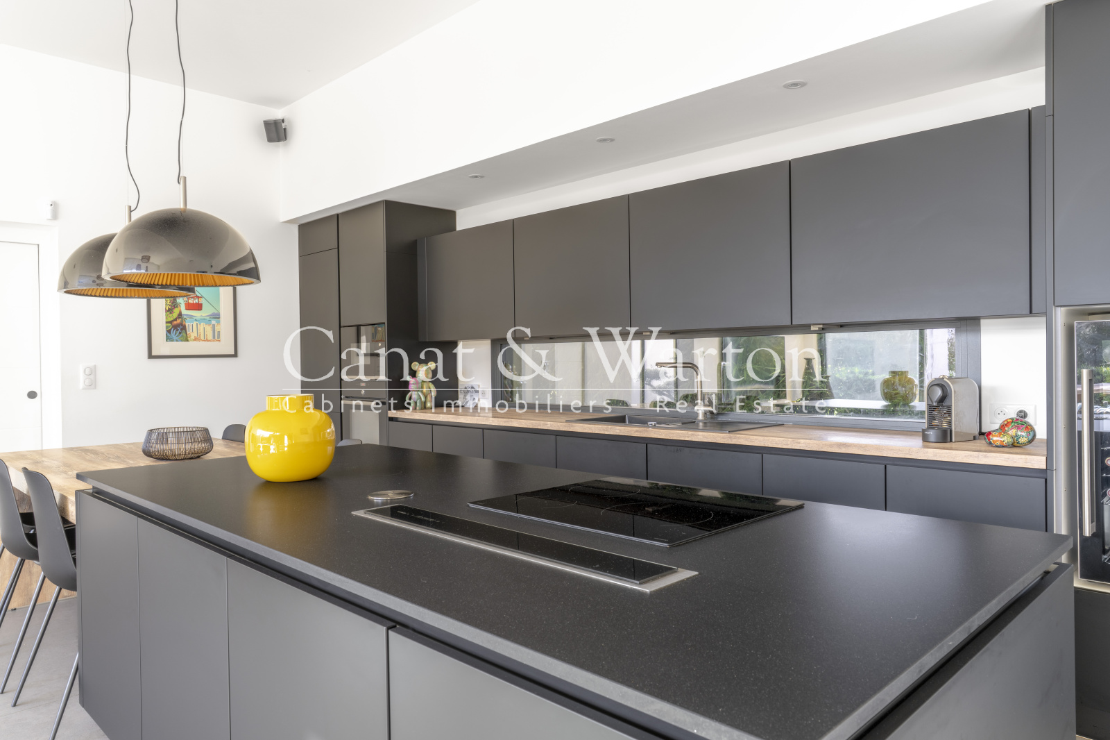 La cuisine ouverte, moderne et entièrement équipée, est complétée par une arrière cuisine discrète, idéale pour le quotidien comme pour recevoir.