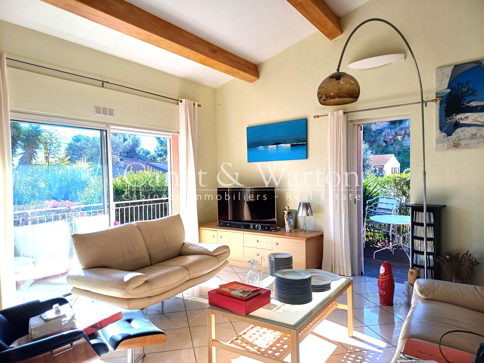 CARQUEIRANNE, à proximité du village, cette agréable villa offre de beaux espaces. Son accès est facile et vous offre au niveau principal : une entrée avec penderie, un grand séjour - salle à manger avec sa cuisine équipée, une arrière-cuisine, le tout donnant sur une agréable terrasse de 67 m² environ exposée plein Sud. Une chambre et un bureau à ce niveau avec salle d'eau et toilette. Au niveau inférieur et de plain-pied avec la piscine, un appartement T2 complète ce bien. Deux grands garages, buanderie, dépendances. Le tout sur un terrain plat arboré de 1000 m2 avec piscine. La vue mer et la localisation de cette villa représentent de réels atouts.