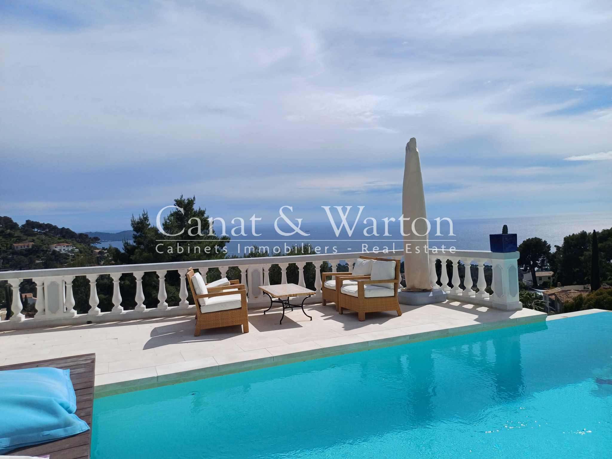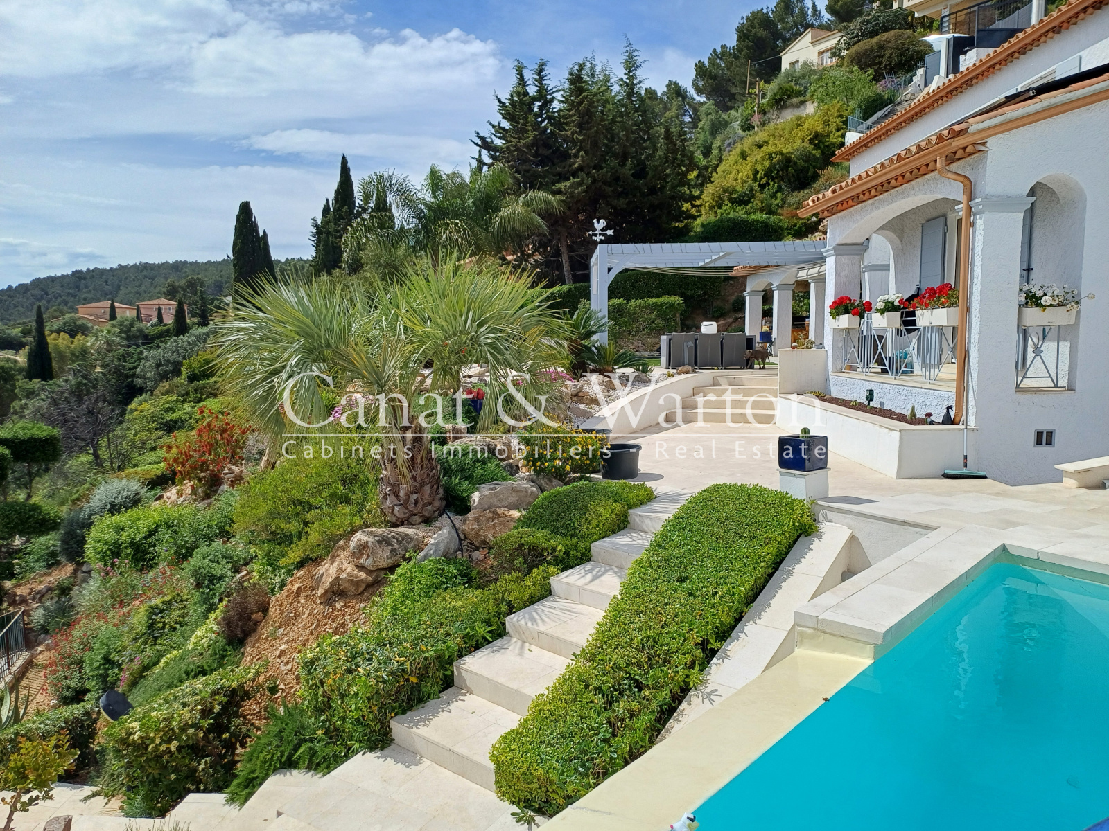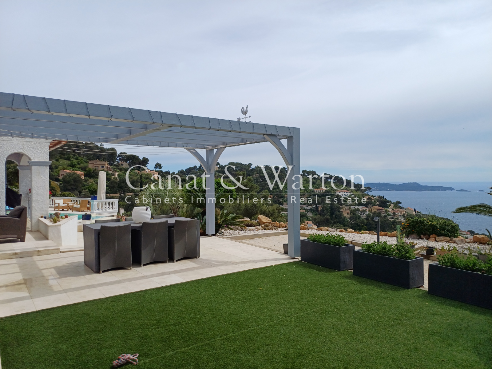 Carqueiranne secteur résidentiel et recherché, plongez dans le bleu de la Meditérannée depuis cette villa au calme absolu. Le séjour avec cuisine ouverte s'ouvre sur la terrasse plein sud et sa magnifique piscine turquoise à débordement. Après la pause fraicheur prenez votre dejeuner sous la terrasse couverte et profitez du boulodrome avec vue mer! Une suite parentale agrémente le plateau du rdj. A l'etage, 3 chambres, 2 salles d'eau et 2 Wc séparés permettent d'acceuillir la famille. Un carport, un garage et un espace cuisine d'été complètent l'ensemble. Idéale pour une maison de vacances dans un cadre idylique pour déconnecter ou une vie à l'année dans un environnement privilégié.