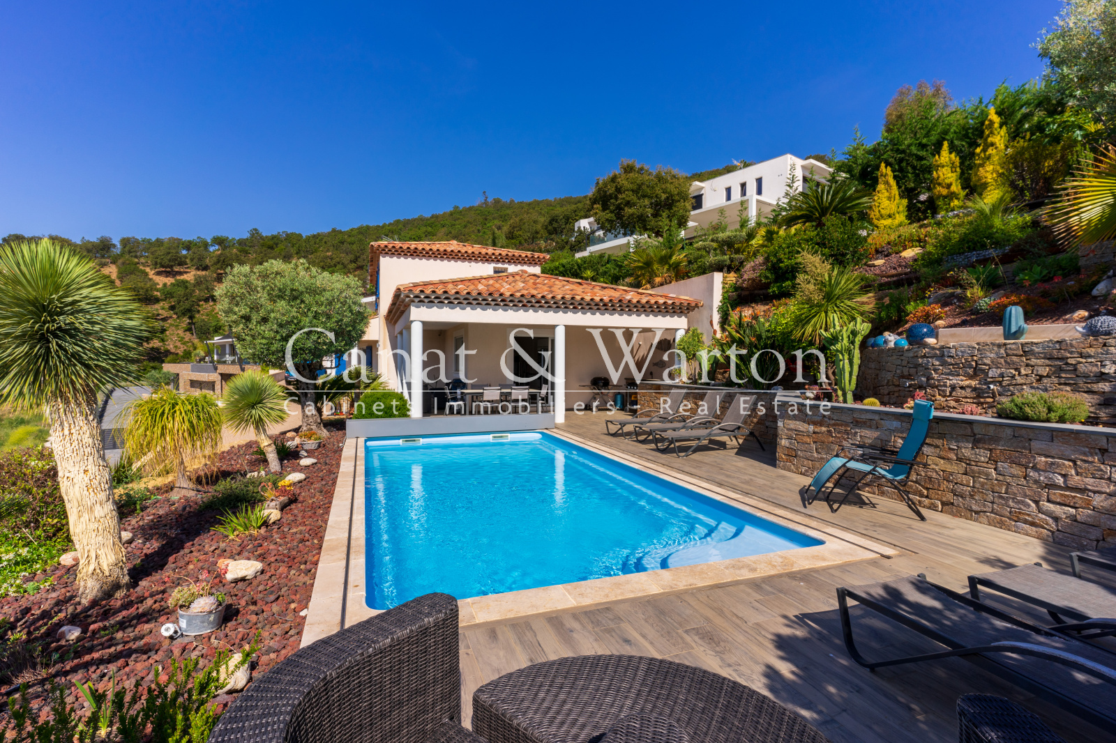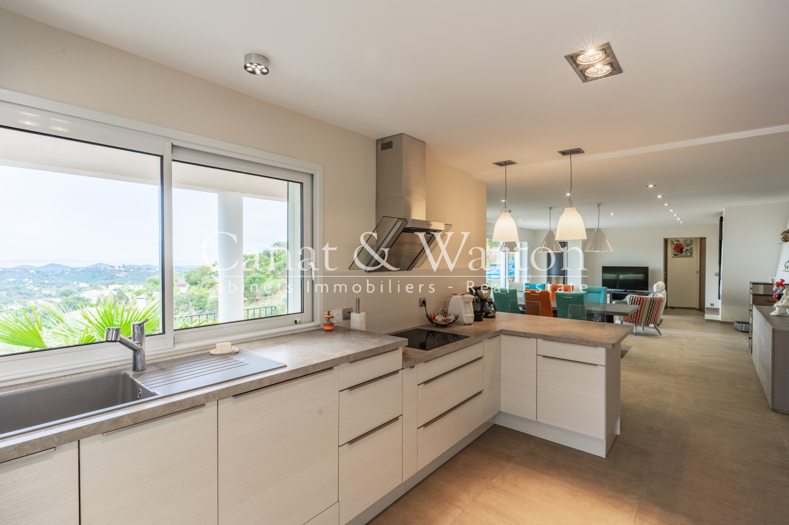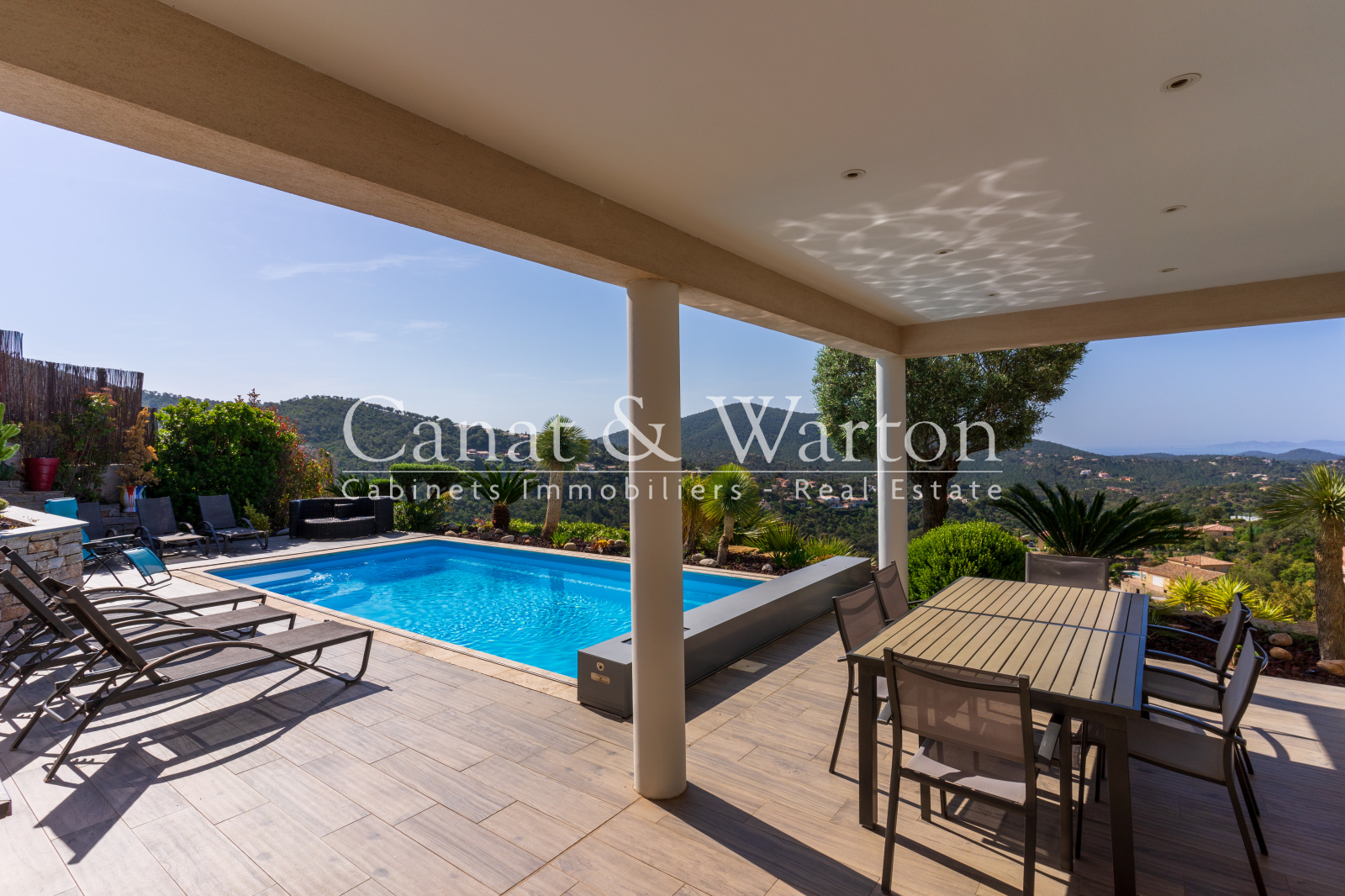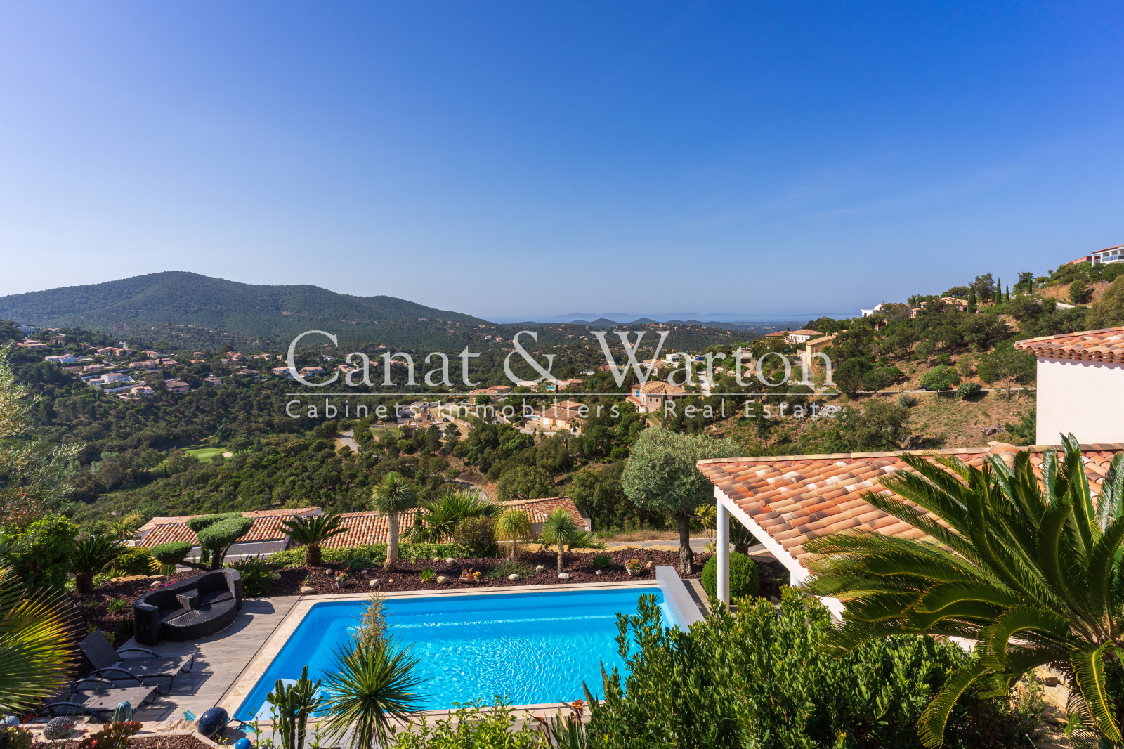 La Londe les Maures, dans un domaine sécurisé et à proximité du golf, très belle vue dégagée mer et collines pour cette villa récente de 2014 facile à vivre et aux belles prestations avec piscine chauffée et terrasse plein Sud sur un terrain paysager de 1225m². Située au calme, la villa vous offre une vie de plain-pied avec une agréable pièce à vivre d'environ 60m2, une suite parentale avec dressing et salle de bains. A l'étage, deux chambres dont une avec sa douche et une salle de bains complètent la villa. Garage carrelé et parkings sur le terrain. DPE C