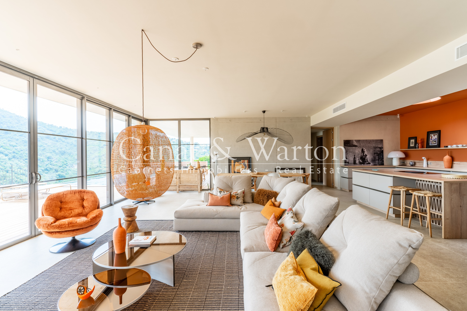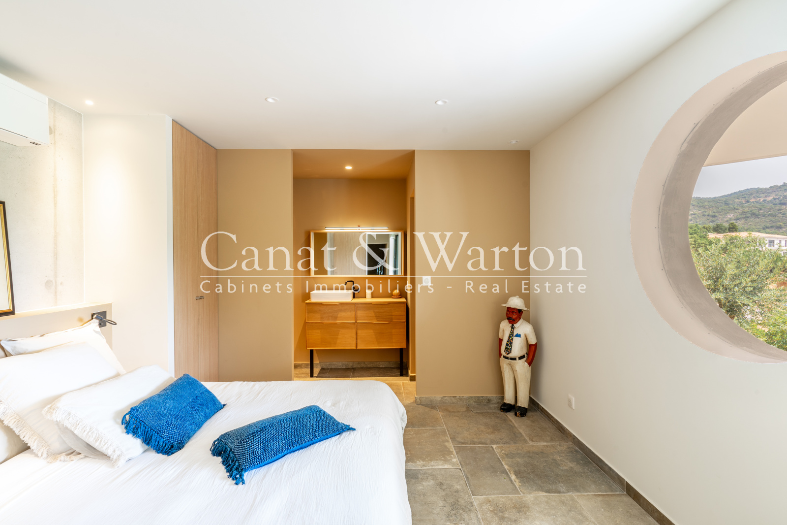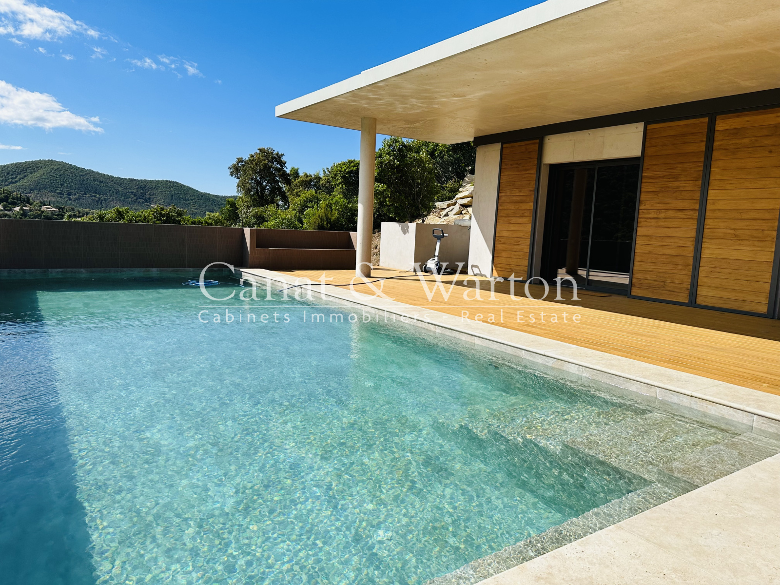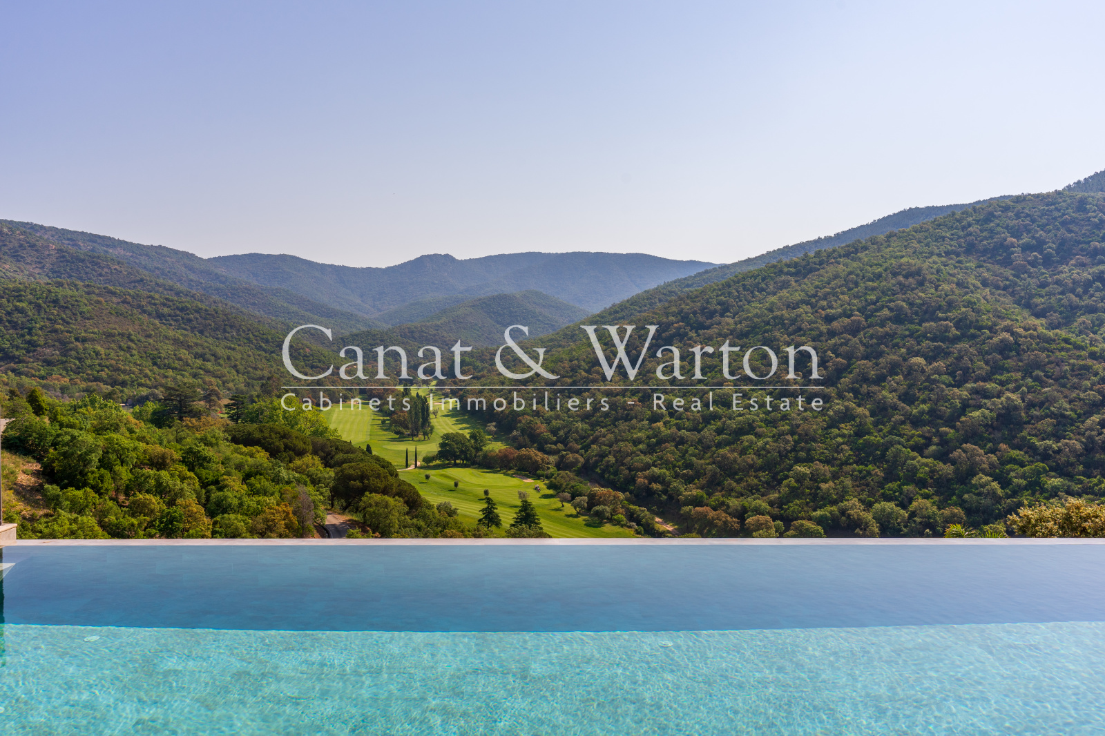 Exceptionnel et rare, La Londe les Maures, domaine de Valcros, dans résidence de standing sécurisée, cette magnifique villa d’architecte neuve de 250m2 complètement intégrée sur un terrain de 1680m2 avec sa très belle piscine à débordement vous offre une vue imprenable sur le golf et les collines. Sa très belle qualité de construction et ses prestations de très haut standing font de cette villa un bien exceptionnel qui vous invite à la détente. Au niveau principal, vous pourrez profiter de la pièce à vivre aux beaux volumes de 87 m2 avec sa cuisine haut de gamme ouverte sur une splendide terrasse en teck face aux collines, ses deux suites parentales avec leur salle de bains privative,une autre chambre et salle d'eau. Au niveau inférieur, un appartement T3 indépendant complète la villa avec son séjour et sa cuisine équipée ouvert également sur une grande terrasse et ses 2 suites parentales. Dépendance de 45m2 aménageable. Avec son architecture harmonieuse et ses matériaux contemporains, la Villa Green s’intègre parfaitement dans son environnement naturel. Emplacement idéal pour les passionnés de golf !