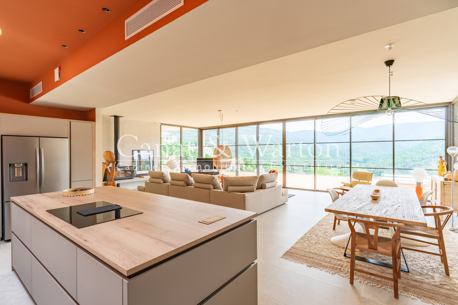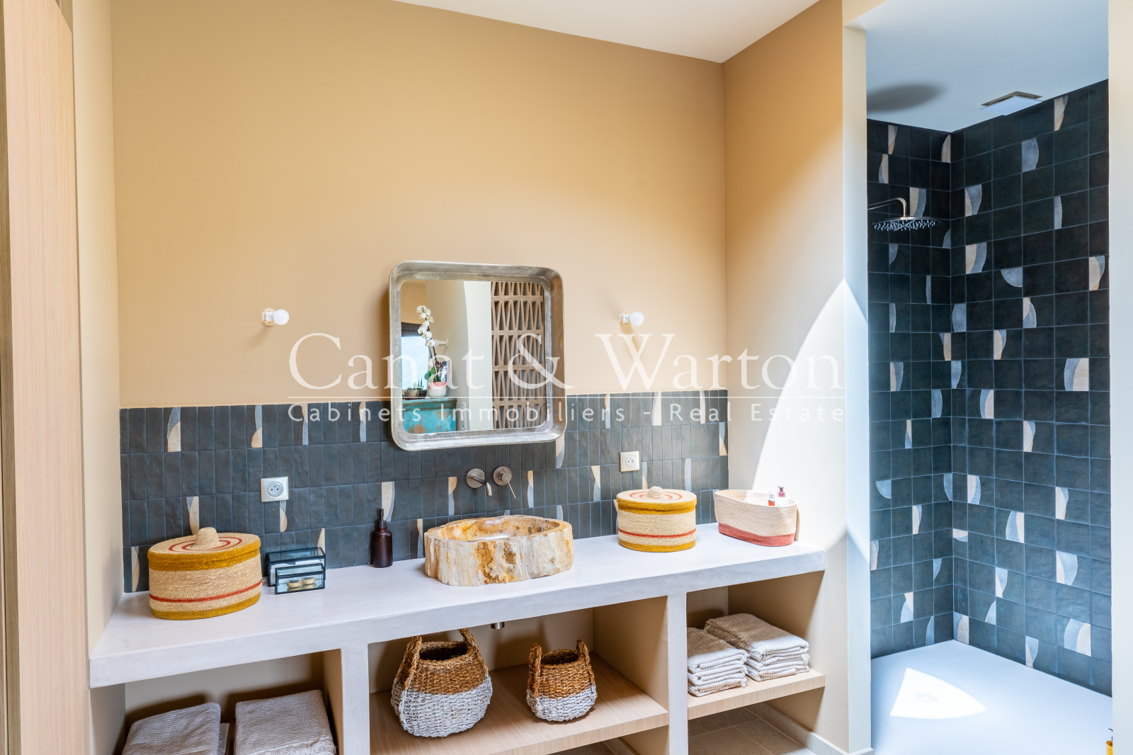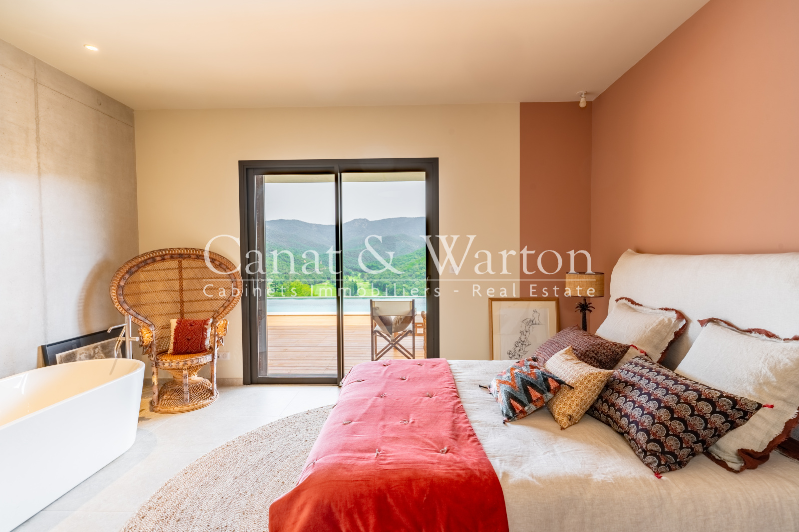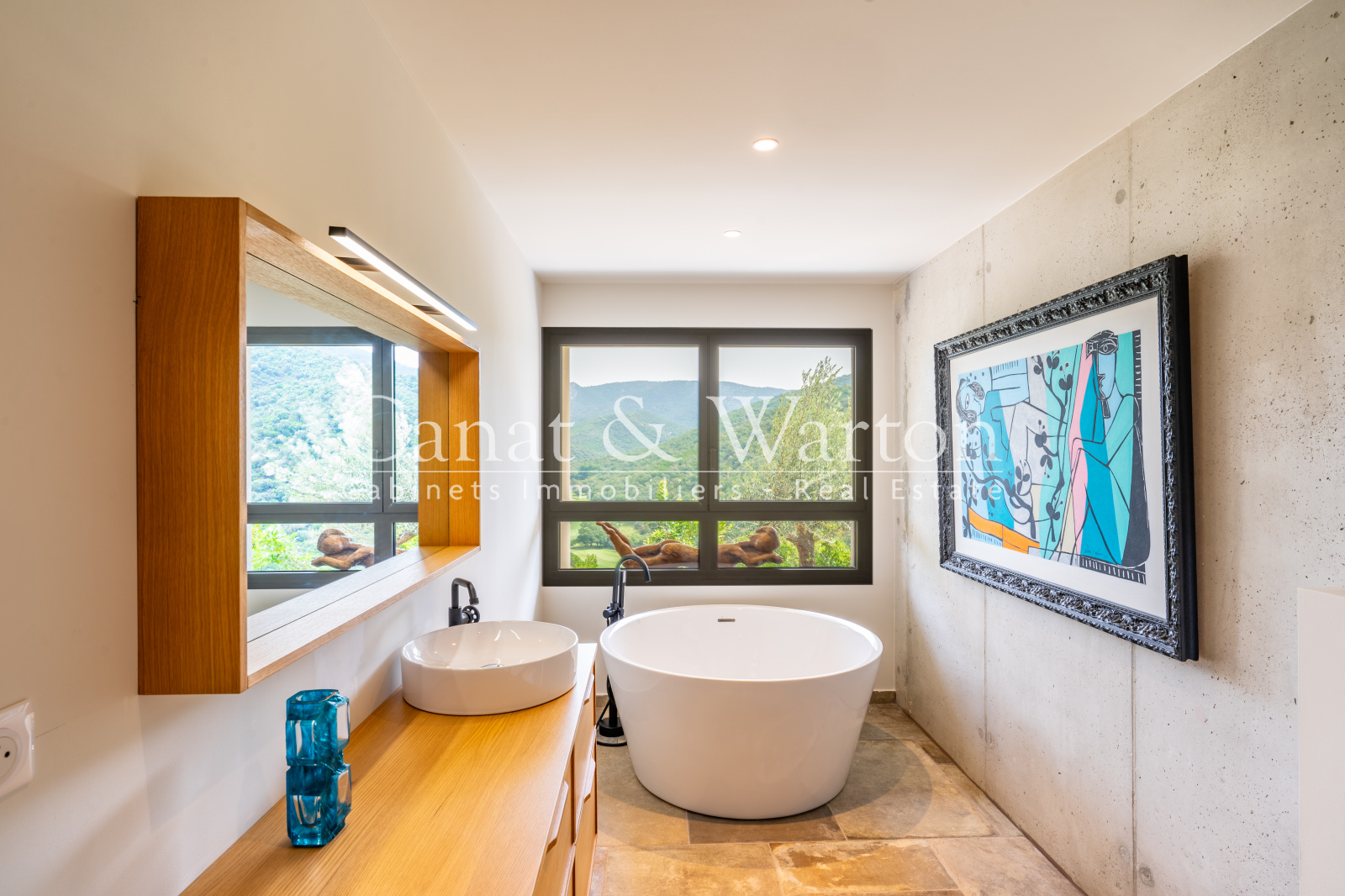 Exceptionnel et rare, La Londe les Maures, domaine de Valcros, dans résidence de standing sécurisée, cette magnifique villa d’architecte neuve de 250m2 complètement intégrée sur un terrain de 1680m2 avec sa très belle piscine à débordement vous offre une vue imprenable sur le golf et les collines. Sa très belle qualité de construction et ses prestations de très haut standing font de cette villa un bien exceptionnel qui vous invite à la détente. Au niveau principal, vous pourrez profiter de la pièce à vivre aux beaux volumes de 87 m2 avec sa cuisine haut de gamme ouverte sur une splendide terrasse en teck face aux collines, ses deux suites parentales avec leur salle de bains privative,une autre chambre et salle d'eau. Au niveau inférieur, un appartement T3 indépendant complète la villa avec son séjour et sa cuisine équipée ouvert également sur une grande terrasse et ses 2 suites parentales. Dépendance de 45m2 aménageable. Avec son architecture harmonieuse et ses matériaux contemporains, la Villa Green s’intègre parfaitement dans son environnement naturel. Emplacement idéal pour les passionnés de golf !
