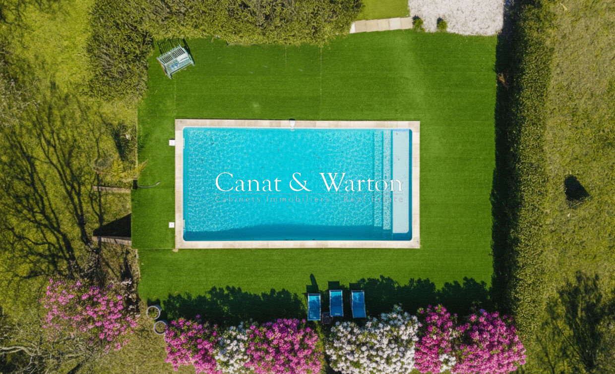 Édifiée sur une superbe parcelle paysagée de plus d'un hectare, la propriété offre de véritables espaces de détente et de loisirs : une vaste piscine de 11x6 m, un garage et un abri de stockage viennent parfaire ce bien rare.