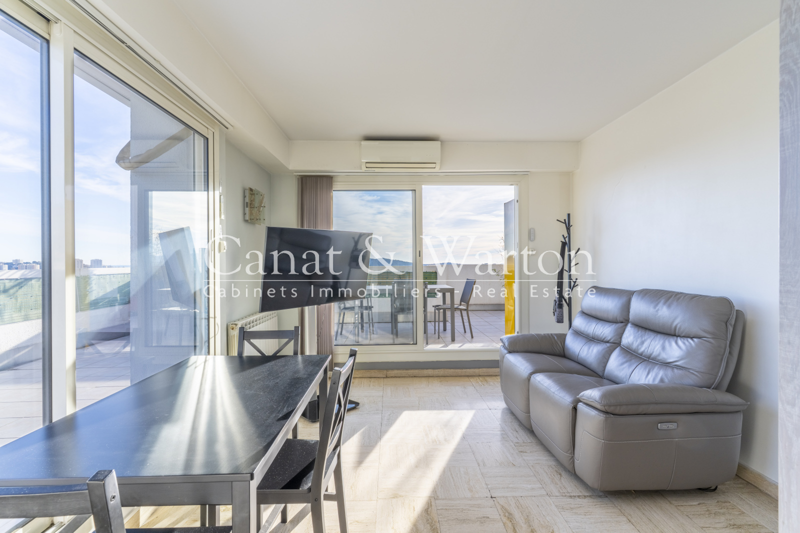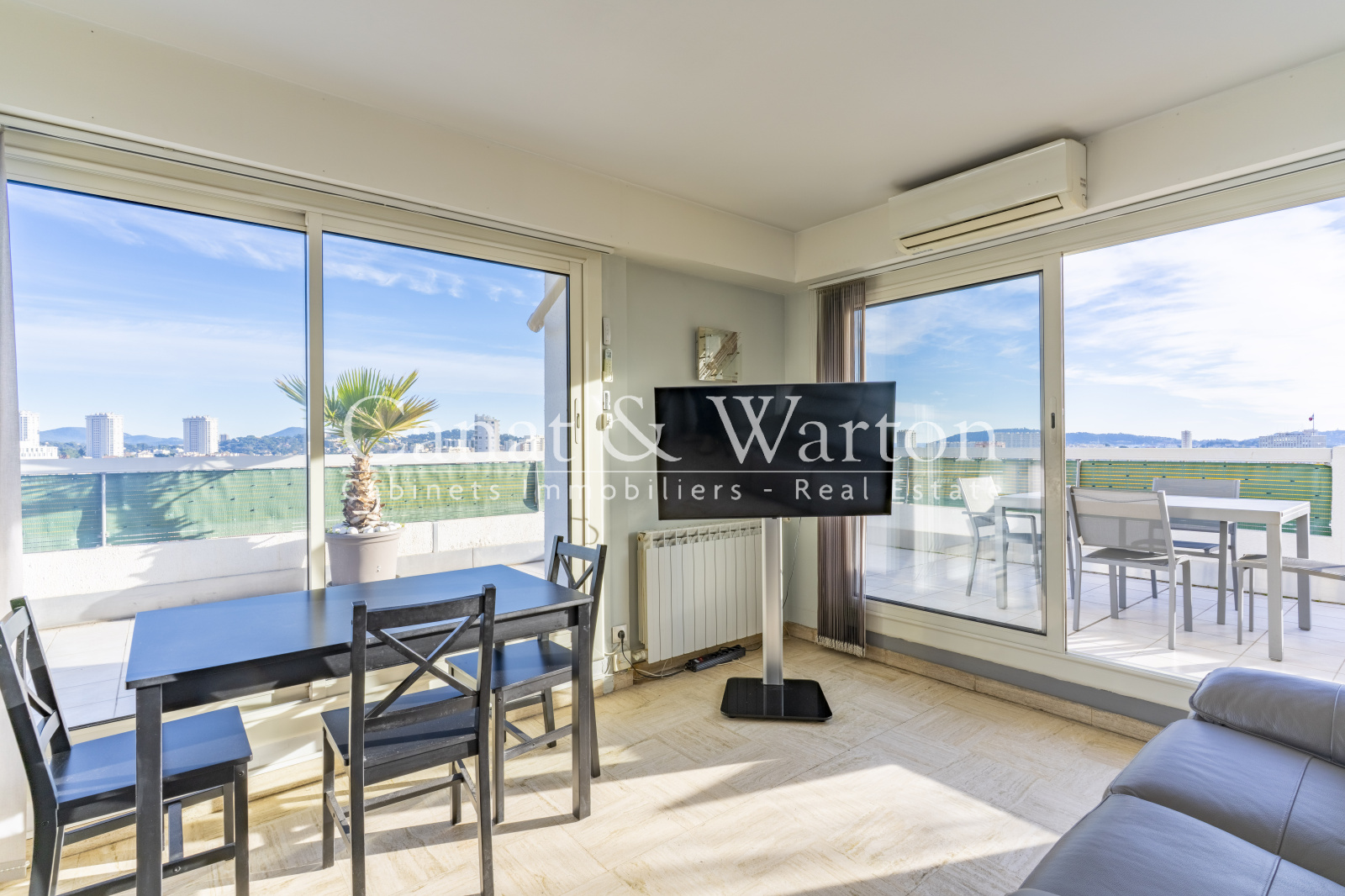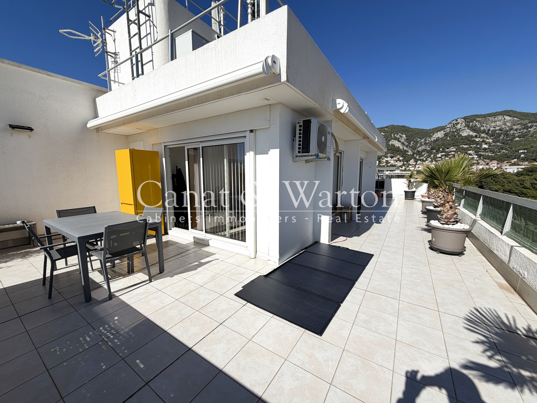 L'appartement est composé d'une pièce à vivre climatisée très lumineuse, grâce à de grandes baies vitrées, une cuisine séparée, une chambre avec salle de bain, wc séparé, et la terrasse de 80m² faisant le tour de l'appartement.