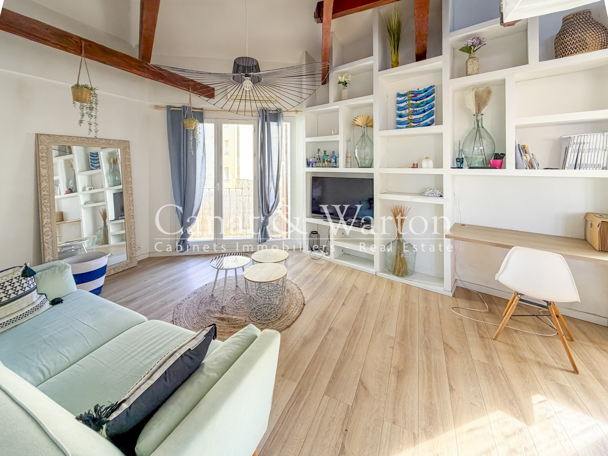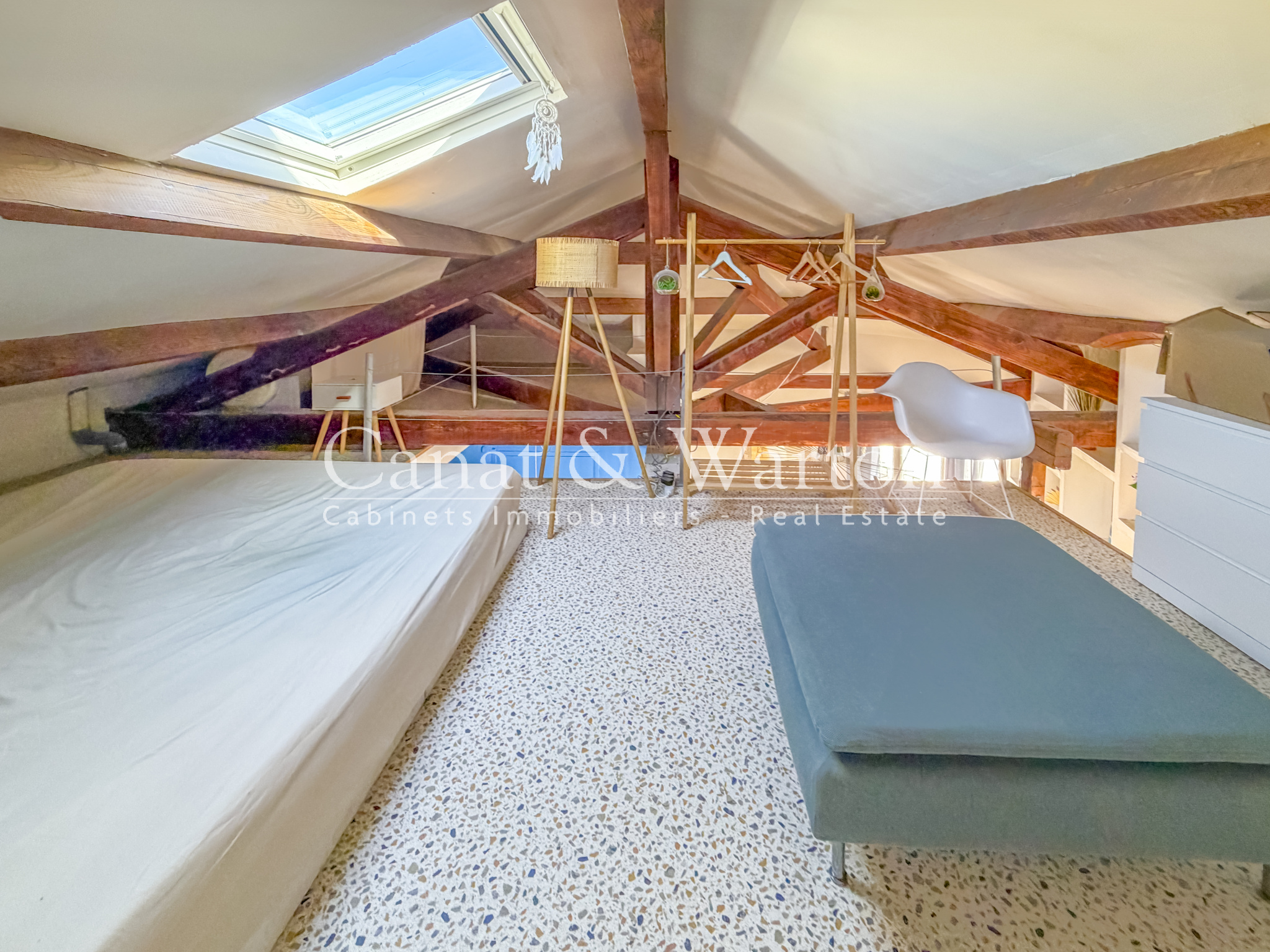 La charpente apparente, associée à la belle hauteur sous plafond du salon cathédrale, confère à cet appartement un cachet unique.