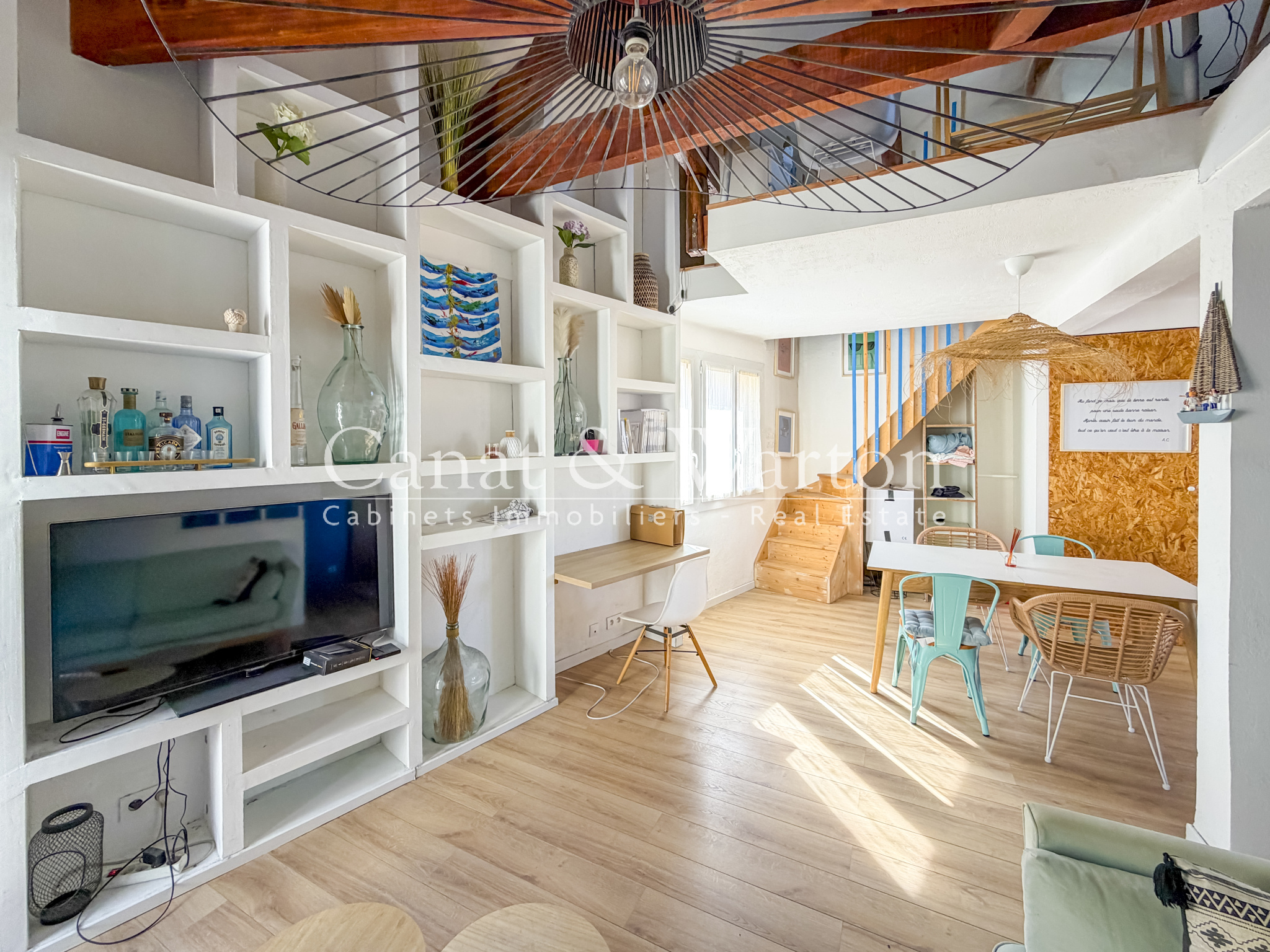 Côté rangements, l’agencement a été optimisé avec : un cellier fermé, discrètement aménagé derrière la cuisine, un dressing sous escalier, un meuble sur mesure toute hauteur dans le salon, intégrant un espace TV ainsi qu’un coin bureau pouvant accueillir deux écrans.