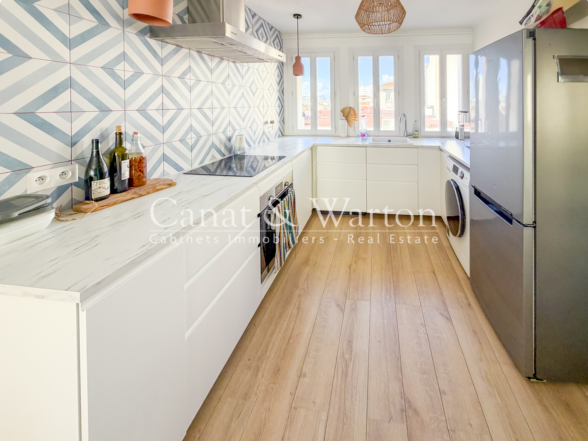 Vous y découvrirez une véritable cuisine ouverte en U, fonctionnelle et parfaitement équipée avec de nombreux rangements et un vaste plan de travail, prolongée par un espace salle à manger et un salon convivial.