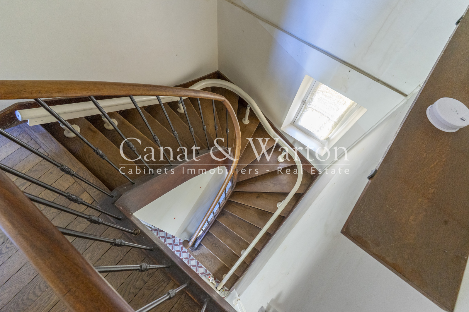 A l'étage : 3 chambres dont une de 20m2 et deux avec salle d'eau, un wc.