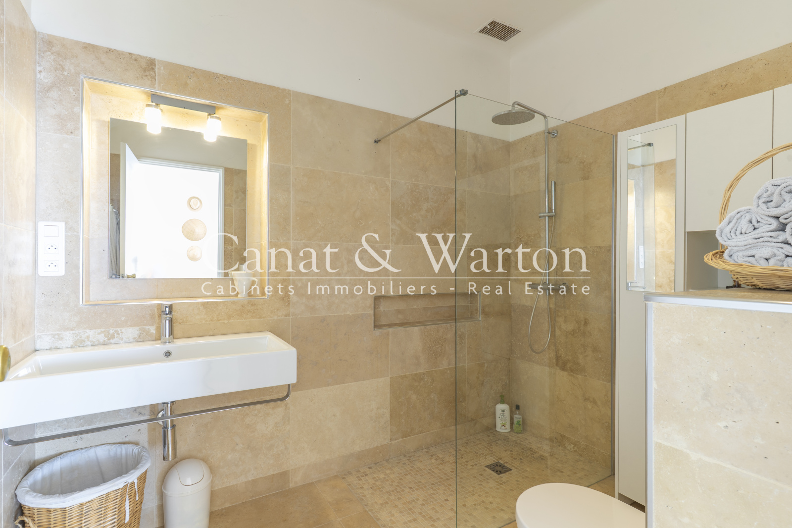 Au rez-de-chaussée : D'une entrée, un double séjour avec cheminée ouvrant sur terrasse vue mer, une cuisine ouverte équipée, 3 chambres dont une suite parentale, une salle d'eau, un dressing.