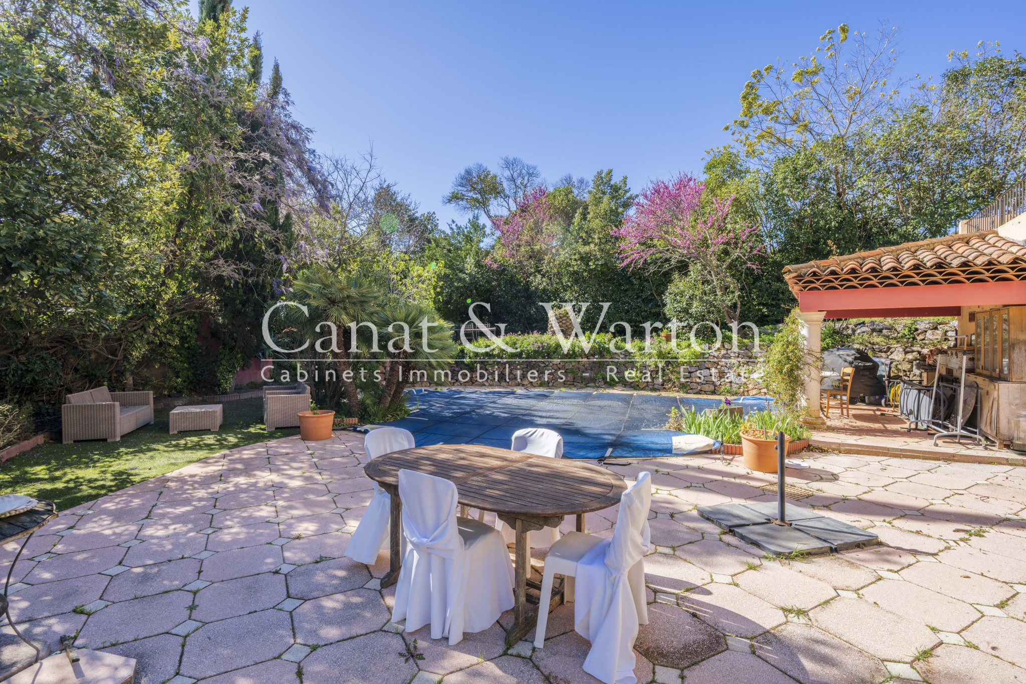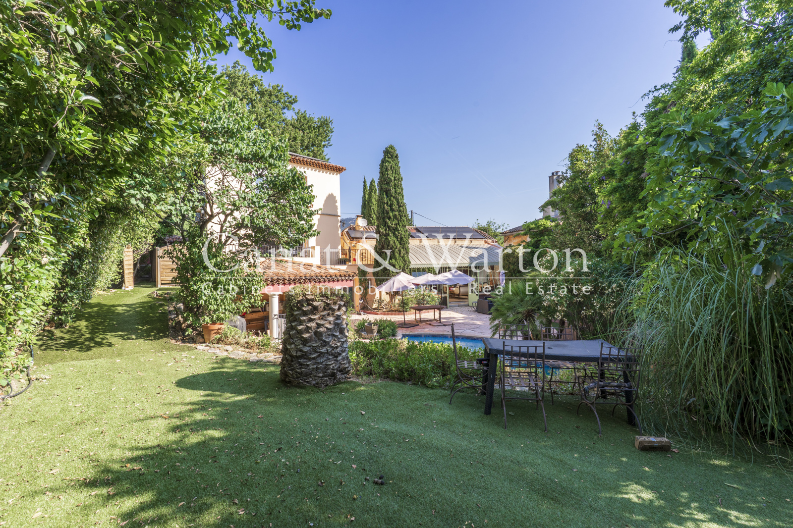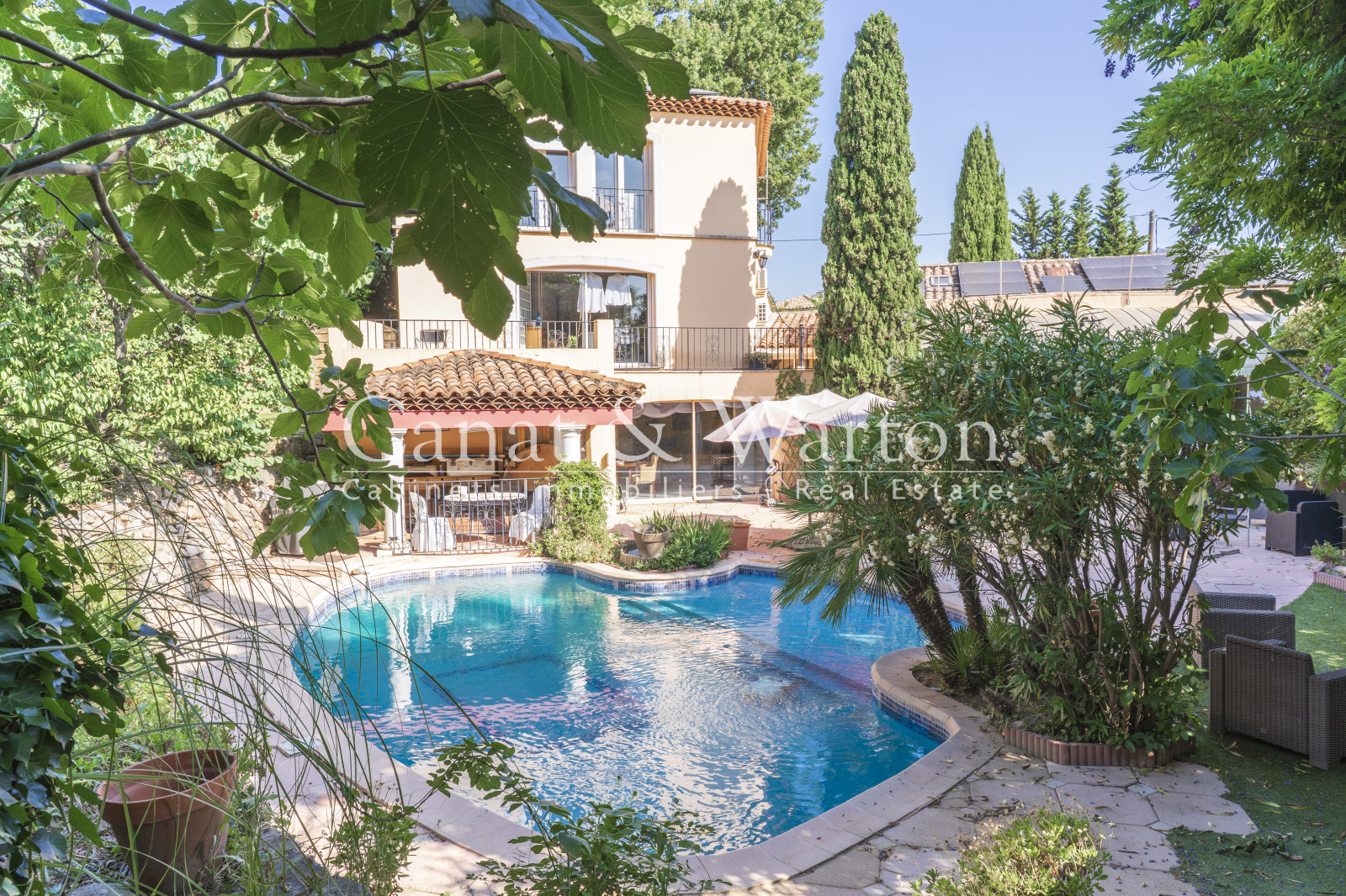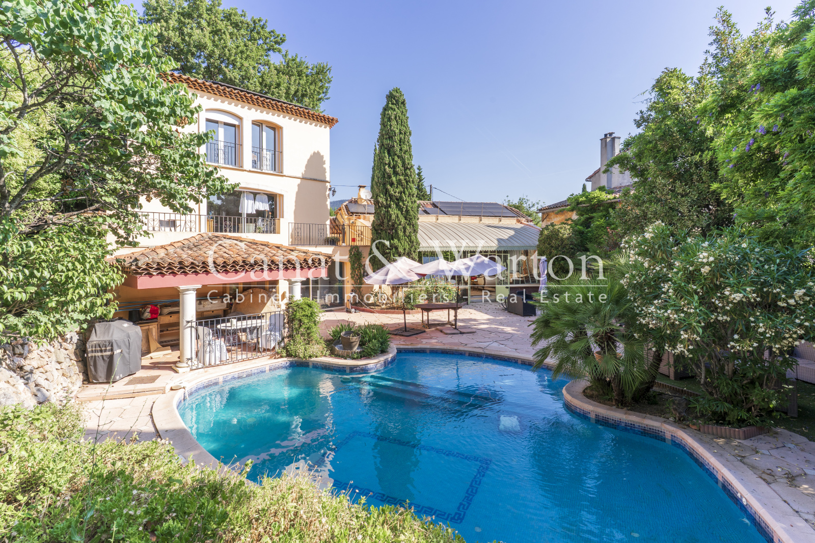 TOULON CAP BRUN, nichée dans son écrin de verdure à l'abris des regard, pour cette propriété de charme très bien située, au plus grand calme et à un quart d'heure à pieds des criques sauvages. La maison principale développe des volumes très spacieux baignés de lumière. Le séjour de plus de 65 m² dispose d'une cheminée et d'un plafond cathédrale avec charpente apparente qui lui confère beaucoup de caractère. Une magnifique verriere Napoleon III sert de liaison entre la pièce à vivre et le jardin et offre un bel espace de réception. L'espace piscine est entouré de larges plages et sans aucun vis à vis, le jardin étant intime et très verdoyant. Cuisine équipée de qualité traitée elle aussi en verrière, patio végétalisé, 4 chambres traitées en suite dont une de plain-pied donnant sur terrasse et jardin, espace bureau. Un studio indépendant de 30 m² environ complète l'ensemble et peut constituer un logement de gardien. Propriété coup de coeur ! DPE C.