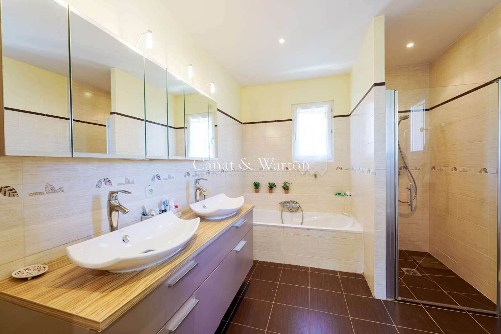 De plain-pied, elle propose un vaste séjour lumineux, une salle à manger, une cuisine américaine , une buanderie et un garage. Trois chambres complètent ce niveau, dont deux en suite.