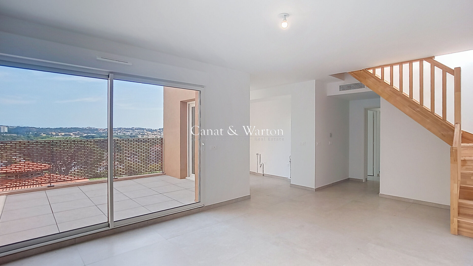 Fréjus, secteur résidentiel, Vente appartement neuf, dernier étage, 4 pièces de 82m² avec terrasse de 12m² et une terrasse sur le toit de 62m², offrant une belle vue mer. L'appartement présente une belle pièce de réception avec sa cuisine semi-ouverte. Il comprend 3 chambres, dont une suite parentale avec salle d'eau, une salle de bain, toilettes.