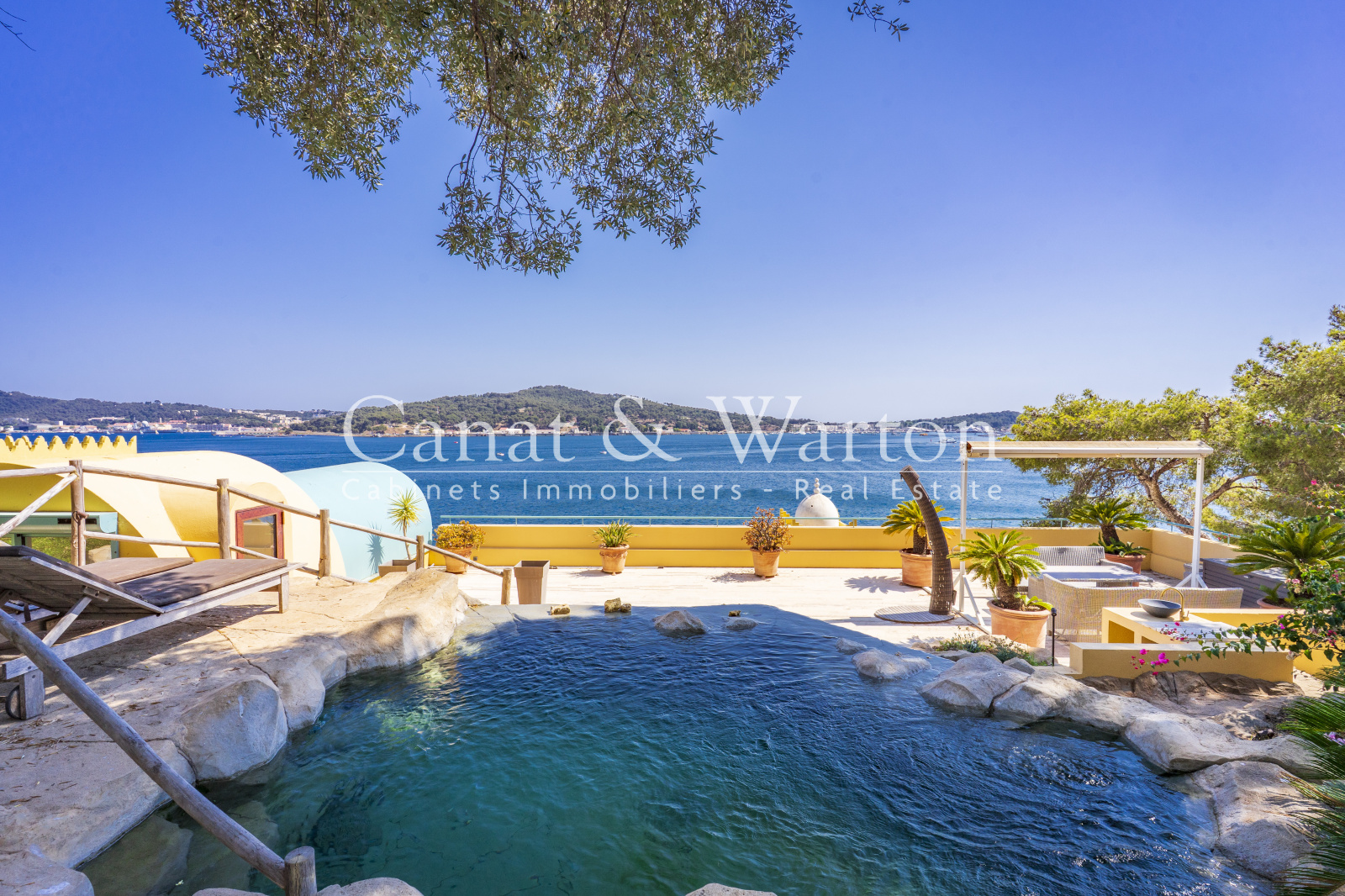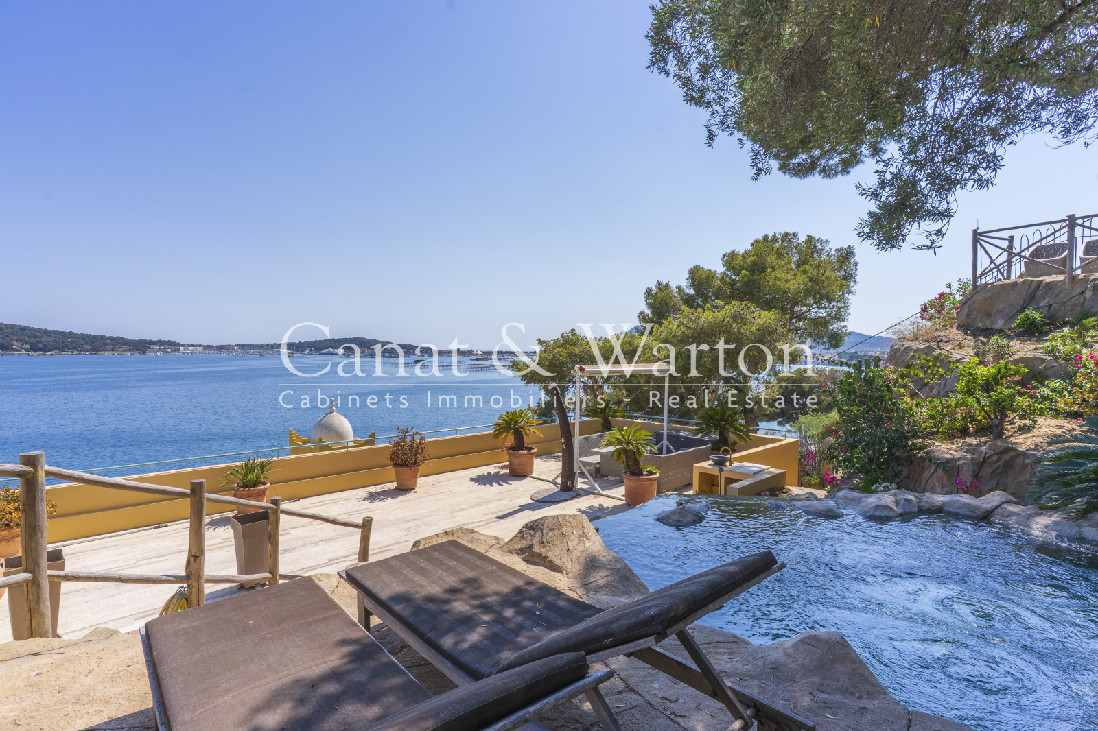 Pour l'extérieur, vous profiterez en plus des multiples terrasses vue mer, un enrochement créé sur mesure, offrant un très beau bassin jacuzzi naturel avec cascade, parfaitement intégré au dessus de la terrasse principale, se mêlant ainsi à a végétation méditerranéenne.