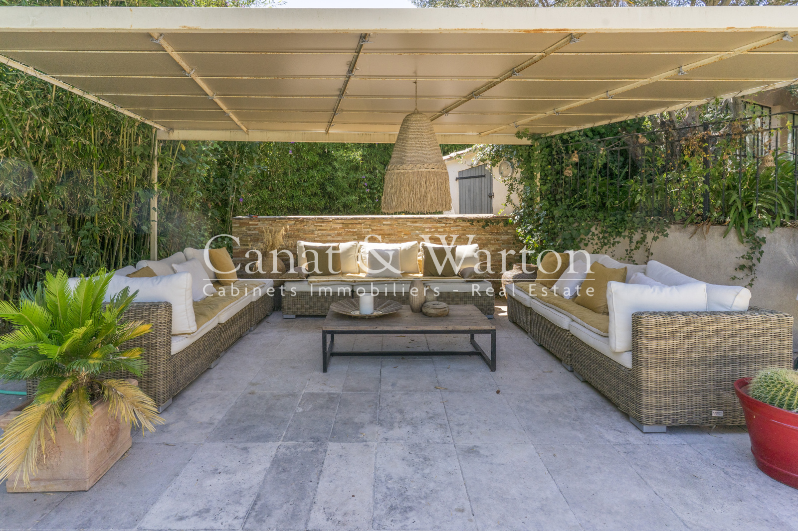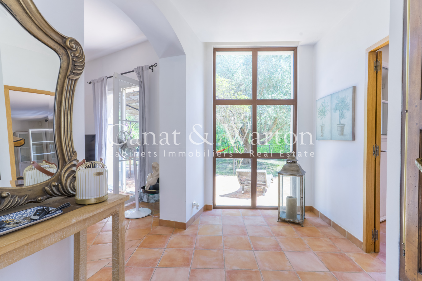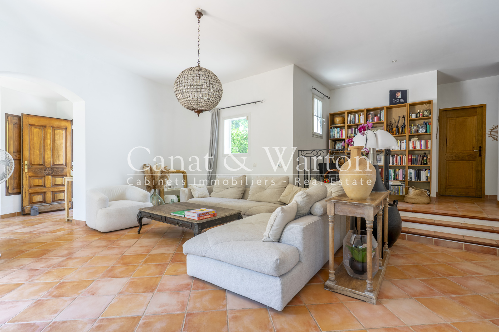 Le séjour lumineux, agrémenté d'une cheminée vitrée et d'un coin bibliothèque, invite à la détente en toute saison donnant sur une magnifique terrasse.