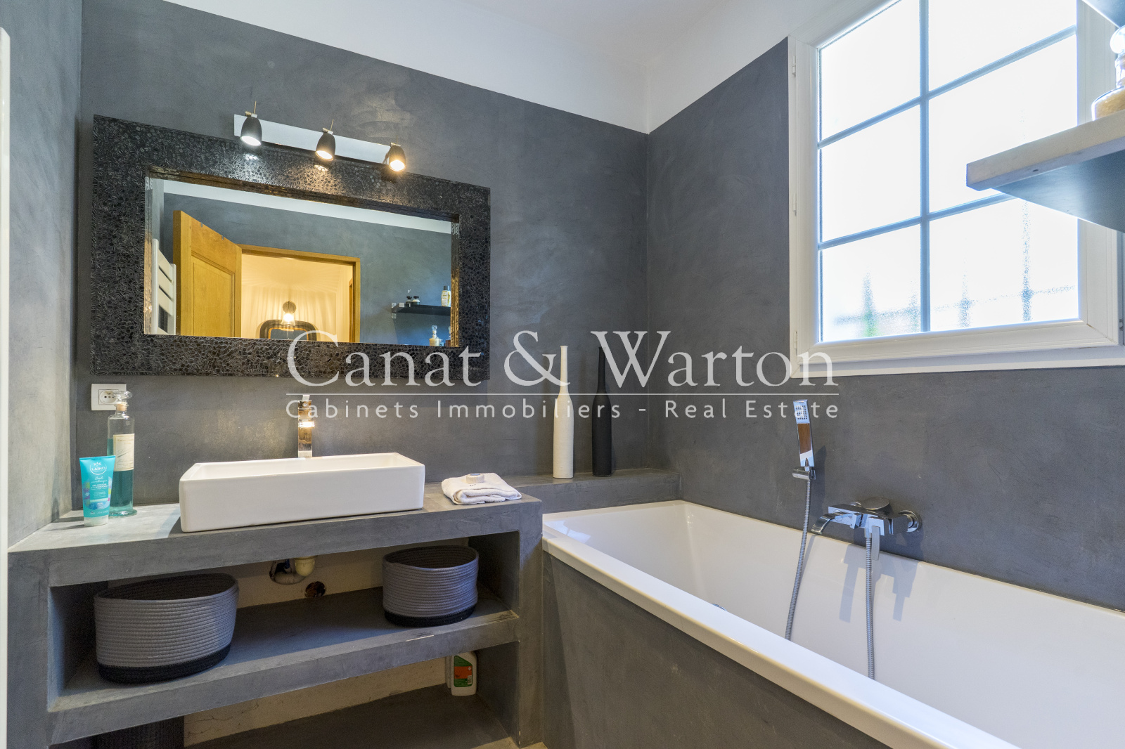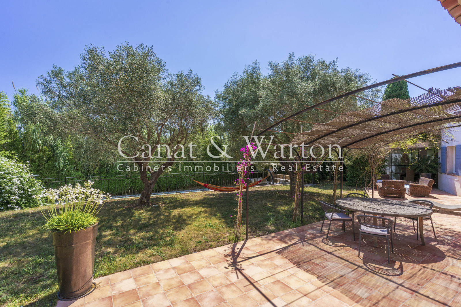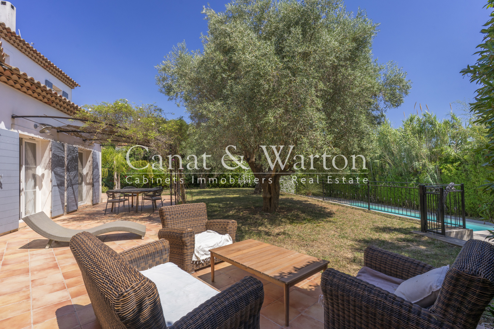 Le séjour lumineux, agrémenté d'une cheminée vitrée et d'un coin bibliothèque, invite à la détente en toute saison donnant sur une magnifique terrasse.