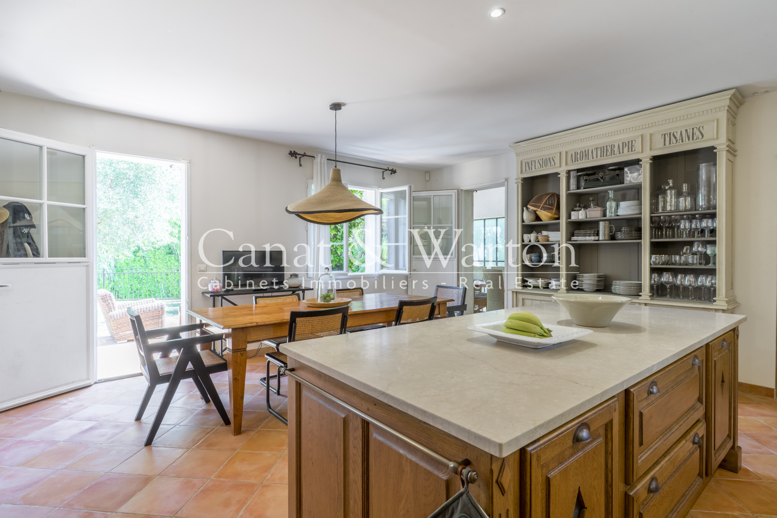 Dès l'entrée, laissez-vous séduire par les volumes chaleureux de cette demeure. Sur la droite, une cuisine dînatoire spacieuse et conviviale, ainsi qu'une arrière cuisine fonctionnelle. Accès direct à une terrasse couverte pour vos repas d'été à l'ombre des tuiles provençales.